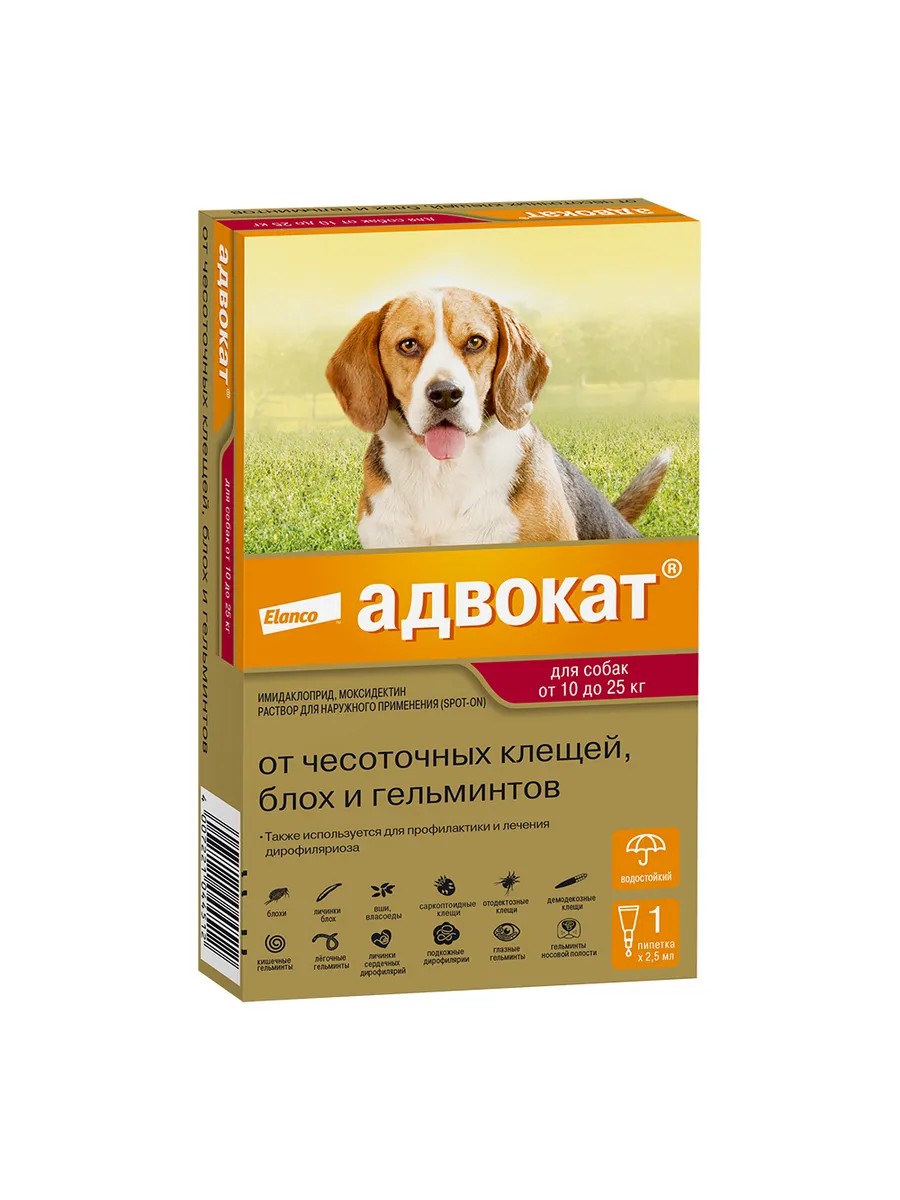 Advocate is a comprehensive product from Elanco that helps protect your pet from a wide range of external (fleas, lice, chewing lice, and scabies mites) and internal (worms) parasites. Advocate is easy to use – drops are applied to the withers in a dosage based on the dog’s weight. Advocate is a broad-spectrum product that is effective against: external parasites – fleas, lice, chewing lice, and scabies mites, which can cause itching in dogs and lead to diseases such as flea allergic dermatitis, otodectosis, sarcoptosis, and demodicosis; internal parasites – roundworms that parasitize the intestines, eyes, and nasal cavity, as well as the larvae of particularly dangerous worms (dirofilaria), whose adults can live in a dog’s heart, as well as dirofilaria under the skin. Dangerous heart parasites have been detected in 13 regions of Russia*. Advantages; A comprehensive product in the form of drops applied to the withers against fleas, scabies mites, and helminths. It has a broad spectrum of action – 18 types of parasites*, prevents heartworms, and is effective for 1 month after application. For puppies and dogs weighing from 10 to 25 kg. Suitable for puppies from 7 weeks of age. It has a 3-year shelf life. Available in packages of 1 and 3 pipettes. An Elanco product, manufactured in Germany. Ingredients: imidacloprid and moxidectin. The pipette volume is 2.5 ml. Imidacloprid acts on fleas, lice, and chewing lice, disrupting the transmission of nerve impulses and leading to the death of parasites. Moxidectin acts on scabies mites – subcutaneous and ear mites, as well as on internal parasites – roundworms, causing their paralysis and death. 1. The product should be applied to dry, intact skin. 2. Before use, pierce the protective membrane of the pipette by replacing the cap on the back. 3. Part the fur until the skin is visible. 4. Apply the contents of the pipette directly to the skin: squeeze the full pipette onto 1 spot between the shoulder blades at the base of the neck*. To kill fleas, lice, and chewing lice, apply the product once; to prevent re-infestation, apply it once every 4 weeks during the insect season. To treat ear mites (otodectosis), apply the product to the withers once. If necessary, repeat the course of treatment after 1 month. To treat sarcoptosis, apply the product once a month for 2 months; for demodicosis, apply it once a month for 2-4 months; for complicated demodicosis, increase the frequency of application to once a week. For deworming, apply the product once for therapeutic purposes, and once a month for prophylactic purposes. For the treatment of eucolasis – once a month for 2 months. For the prevention of cardiac and cutaneous dirofilariasis, the drug is used monthly, starting 1 month before the onset of mosquito summer (carriers of the pathogen D. immitis and D. repens) and ending 1 month after the end of mosquito summer. If microfilariae (stage L1) of D. immitis are detected in the blood, the drug is used once a month for 2 months. For the treatment of cutaneous dirofilariasis (adult stages of D. repens), the drug is used once a month for 6 months, and to reduce the number of microfilariae (stage L1) of D. repens – once for 4 months. Pharmacological action: Imidacloprid is an insecticide whose mechanism of action is based on interaction with arthropod receptors and disruption of nerve impulse transmission, which leads to the death of insects. After application to the skin, imidacloprid is virtually unabsorbed and quickly spreads over the body surface. It remains on the skin and fur, exerting a long-lasting contact insecticidal effect. Do not use in puppies under 7 weeks of age, dogs with infectious diseases or recovering from illnesses, or other animal species. Side effects: When used according to these instructions, side effects and complications are generally not observed. In rare cases, individual skin reactions (redness, itching) may occur after use; these will resolve spontaneously and do not require the use of medication. Special instructions: Pregnant and lactating dogs, and dogs weighing less than 1 kg, if necessary, should be treated with caution under the supervision of a veterinarian. Do not pet the animal or allow it near small children for 24 hours after treatment. Storage conditions: Store the product in its original packaging, away from food and feed, out of the reach of children and animals, at a temperature of 2°C to 30°C. Release form: solution for external use (drops on the withers). Shelf life: 3 years from date of manufacture. Do not use after the expiration date. Made in Germany.