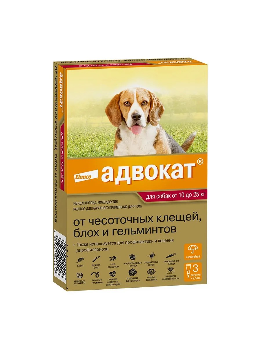 Advocate is a comprehensive product from Elanco that helps protect your pet from a wide range of external (fleas, lice, chewing lice, and scabies mites) and internal (worms) parasites. Advocate is easy to use – apply drops to the withers in a dosage based on the dog's weight. Advocate is a broad-spectrum product that is effective against: external parasites – fleas, lice, chewing lice, and scabies mites, which can cause itching in dogs and lead to diseases such as flea allergic dermatitis, otodectosis, sarcoptic mange, and demodicosis; internal parasites – roundworms that infest the intestines, eyes, and nasal cavity, as well as the larvae of particularly dangerous worms (dirofilaria), whose adult worms can live in a dog's heart, as well as dirofilaria under the skin. Advantages: A comprehensive product in the form of drops applied to the withers against fleas, scabies mites, and helminths. It has a broad spectrum of action – 18 types of parasites*, prevents heartworms, and is effective for 1 month after application. For puppies and dogs weighing from 10 to 25 kg. Suitable for puppies from 7 weeks of age. It has a 3-year shelf life. Available in packages of 1 and 3 pipettes. An Elanco product, manufactured in Germany. Ingredients: imidacloprid and moxidectin. The pipette volume is 2.5 ml. Imidacloprid acts on fleas, lice, and chewing lice, disrupting the transmission of nerve impulses and leading to the death of parasites. Moxidectin acts on scabies mites – subcutaneous and ear mites, as well as on internal parasites – roundworms, causing their paralysis and death. 1. The product should be applied to dry, intact skin. 2. Before use, pierce the protective membrane of the pipette by replacing the cap on the back. 3. Part the fur until the skin is visible. 4. Apply the contents of the pipette directly to the skin: squeeze the full pipette onto 1 spot between the shoulder blades at the base of the neck*. To kill fleas, lice, and chewing lice, apply the product once; to prevent re-infestation, apply it once every 4 weeks during the insect season. To treat ear mites (otodectosis), apply the product to the withers once. If necessary, repeat the course of treatment after 1 month. To treat sarcoptosis, apply the product once a month for 2 months; for demodicosis, apply it once a month for 2-4 months; for complicated demodicosis, increase the frequency of application to once a week. For deworming, apply the product once for therapeutic purposes, and once a month for prophylactic purposes. If microfilariae (stage L1) of D. immitis are detected in the blood, the drug is administered once a month for two months. For the treatment of cutaneous dirofilariasis (adult stages of D. repens), the drug is administered once a month for six months. To reduce the number of microfilariae (stage L1) of D. repens, the drug is administered once a month for four months. Pharmacological action: Imidacloprid is an insecticide whose mechanism of action is based on interaction with arthropod receptors and disruption of nerve impulse transmission, leading to the death of insects. After application to the skin, imidacloprid is virtually unabsorbed, rapidly spreading over the body surface and, remaining on the skin and fur, exerting a long-lasting contact insecticidal effect. Moxidectin belongs to the milbemycin group (macrocyclic lactones). It binds to postsynaptic receptors and causes disruption of muscle innervation, paralysis, and death of external parasites and roundworms. It is well absorbed and enters the bloodstream, organs, and tissues, and is excreted within 30 days, primarily unchanged in feces. Contraindications: Contraindications include hypersensitivity to any of the drug's components. Do not administer to puppies under 7 weeks of age, dogs with infectious diseases, recovering dogs, or other animals. Side effects: When used according to these instructions, side effects and complications are generally not observed. In rare cases, individual skin reactions (redness, itching) may occur after administration. These reactions resolve spontaneously and do not require the use of medication. Special instructions: Pregnant and lactating dogs, and dogs weighing less than 1 kg, should be treated with caution under the supervision of a veterinarian if necessary. Avoid petting the animal or allowing it near small children for 24 hours after treatment. Storage conditions: Store the product in its original packaging, away from food and feed, out of the reach of children and animals, at temperatures between 2°C and 30°C. Dosage form: Solution for external use (drops on the withers). Shelf life: 3 years from date of manufacture. Do not use after the expiration date. Made in Germany.