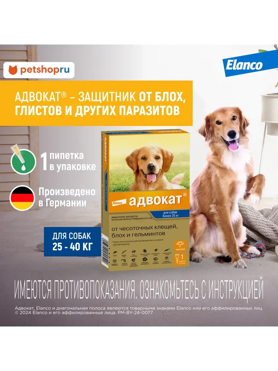 Адвокат прост в применении - капли наносятся на холку в дозировке согласно весу собаки. Производится в Германии.