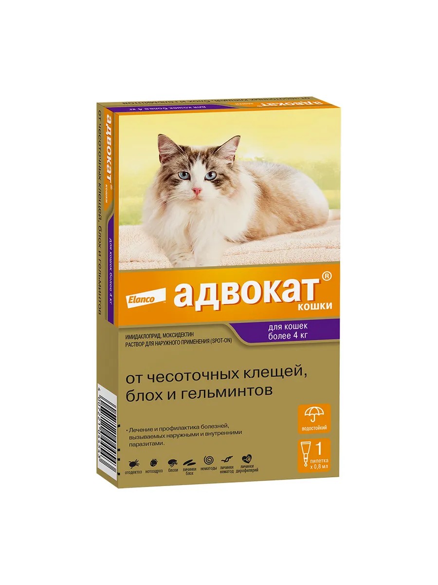 Cat Advocate is a comprehensive product from Elanco that helps protect your pet from a wide range of external (fleas, scabies mites) and internal (worms) parasites. Cat Advocate is easy to use – just apply drops to the withers, dosing according to the cat's weight. Manufactured in Germany, Cat Advocate is a broad-spectrum product that covers: external parasites – fleas and scabies mites, which can cause itching in cats and lead to diseases such as flea allergic dermatitis, otodectes mange, and notoedric mange; internal parasites – roundworms, which infest the intestines and lungs, as well as the larvae of particularly dangerous worms (dirofilaria). Dangerous heartworms have been detected in 13 regions of Russia*. Benefits: A comprehensive treatment in the form of drops applied to the withers against fleas, scabies mites, and helminths. It has a broad spectrum of action – 7 types of parasites*. It is effective for ear mites and lasts for 1 month after application. It is suitable for kittens over 9 weeks of age. It has a 3-year shelf life. It is available in 1- and 3-pipette packages. It is an Elanco product and is manufactured in Germany. Ingredients: imidacloprid and moxidectin. Each pipette contains 0.8 ml. Imidacloprid acts on fleas by disrupting the transmission of nerve impulses and causing the death of the parasites. Moxidectin acts on scabies mites – subcutaneous and ear mites, as well as on internal parasites – roundworms, causing their paralysis and death. Directions for use and dosage: 1. Apply the product to dry, intact skin. 2. Before use, pierce the protective membrane of the pipette by replacing the cap on the back. 3. Part the fur until the skin is visible. 4. Apply the contents of the pipette directly to the skin: squeeze the full pipette onto 1 spot between the shoulder blades at the base of the neck*. For fleas, the treatment is carried out once, for cats - once every 4 weeks. For the treatment of ear mites (otodectosis), the drug is applied to the withers once. If necessary, the course of treatment is repeated after 1 month. For the treatment of notoedrosis and pulmonary capillariasis, the drug is applied to the withers once. For deworming, the drug is used once. For the prevention of the cardiac form of dirofilariasis, the drug is used monthly, starting 1 month before the onset of mosquito season (carriers of the D. immitis pathogen) and ending 1 month after the end of mosquito season. Pharmacological action: Imidacloprid is an insecticide whose mechanism of action is based on interaction with arthropod receptors and disruption of nerve impulse transmission, leading to the death of insects. After application to the skin, imidacloprid is virtually unabsorbed and quickly distributed over the body surface. Residing on the skin and fur, it exerts a long-lasting contact insecticidal effect. Moxidectin, a milbemycin (macrocyclic lactone), binds to postsynaptic receptors and causes disruption of muscle innervation, paralysis, and death of external parasites and roundworms. It is well absorbed and enters the bloodstream, organs, and tissues, and is excreted within 30 days, primarily unchanged in feces. Contraindications: Contraindications include hypersensitivity to any of the components of the product. Do not use in kittens under 9 weeks of age, cats with infectious diseases, or cats that are recovering. Side effects: When using the product according to these instructions, side effects and complications are generally not observed. In rare cases, the following symptoms may occur: redness of the skin, erythema, itching, vomiting, which pass spontaneously and do not require the use of drugs. Special instructions: Treatment of pregnant and lactating cats, cats weighing less than 1 kg, if necessary, should be carried out with caution under the supervision of a veterinarian. Do not pet the animal or allow it to come into contact with small children for 24 hours after treatment. Storage conditions: Store the product in the manufacturer's sealed packaging, separate from food and feed, in places inaccessible to children and animals, at a temperature of 2 ° C to 30 ° C. Release form: solution for external use (drops on the withers). Shelf life: 3 years from the date of manufacture. Do not use after the expiration date. Made in: Germany