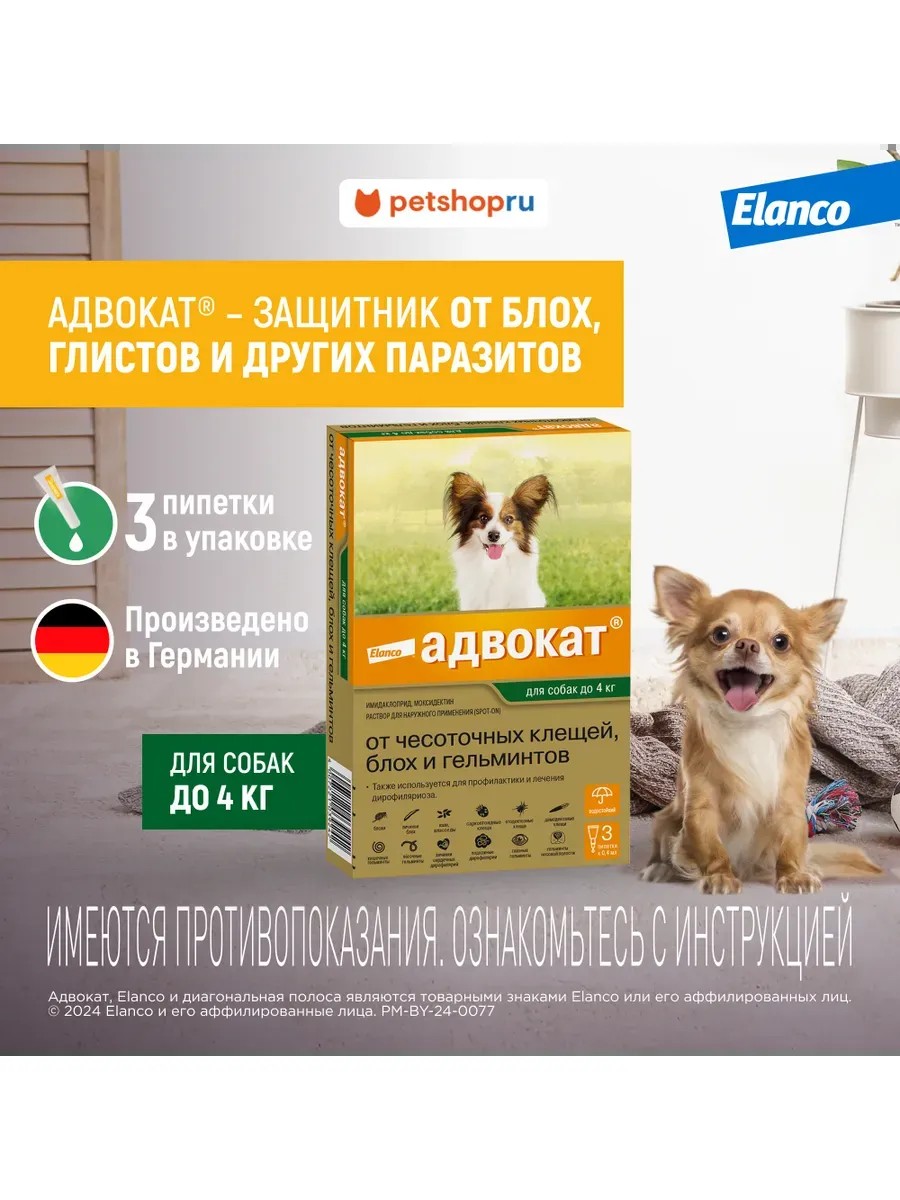 Адвокат прост в применении - капли наносятся на холку в дозировке согласно весу собаки. Производится в Германии.