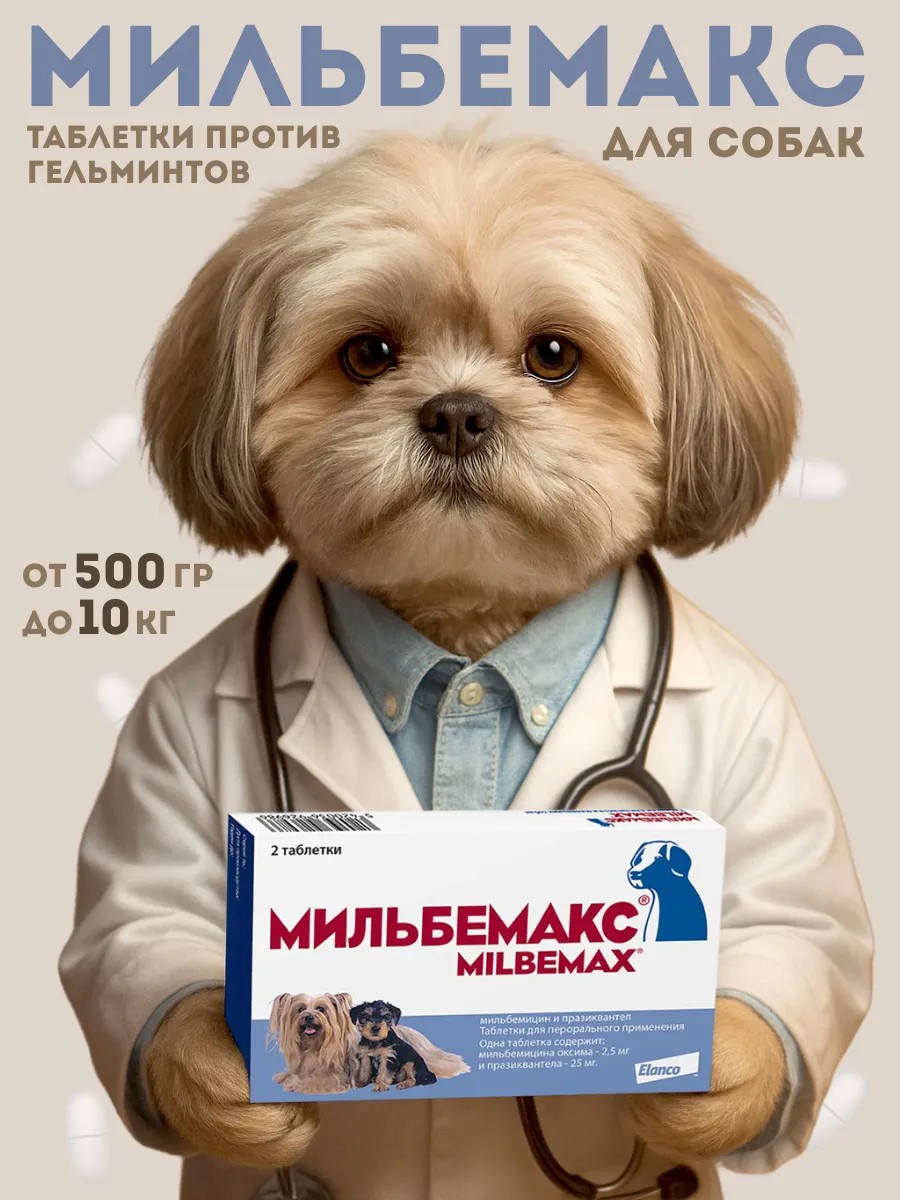 | Полное наименование товара | Мильбемакс, таблетки от гельминтов для щенков и маленьких собак, 2 шт. |