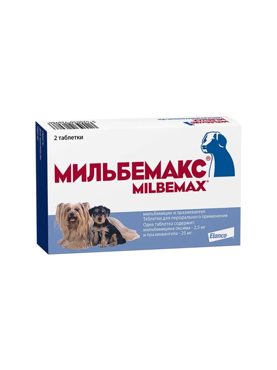 Комбинированный противогельминтный препарат.br/br/Собакам для лечения и профилактики: — цестодозов, вызванных гельминтами видов Dipylidium caninum, Taenia spp., Echinococcus spp., Mesocestoides spp.; — нематодозов, вызванных гельминтами Мильбемакс – антигельминтик широкого спектра, действующий на:br/br/- различные виды круглых (токсокары, токсоскары, анкилостомы, власоглавы, дирофилярии и др.) гельминтов,br/br/- различные виды ленточных (дипилидии, тении, эхинококки и др.) гельминтов.br/br/Мильбемакс также действует на личинок опасных сердечных паразитов – дирофилярий, взрослые особи которых паразитируют в сердечно-сосудистой системе. С целью профилактики дирофиляриоза препарат применяют в период лёта комаров в весенне-летне-осенний период, начиная применение за один месяц до начала лёта комаров, затем каждые 30 дней до окончания сезона, последнюю обработку проводят однократно через месяц после завершения лета насекомых.br/br/Мильбемакс применяют однократно во время кормления с небольшим количеством корма или вводят принудительно на корень языка после кормления в минимальной терапевтической дозе 0,5 мг мильбемицина оксима и 5 мг празиквантела на 1 кг массы животного, из расчета:br/br/Macca животного / таблетки для щенков и маленьких собак (овальные белого цвета)br/br/0,5–1 кг - ½ таблеткиbr/br/ 1 — 5 кг - 1 таблеткаbr/br/ 5–10 кг - 2 таблеткиbr/br/Предварительной голодной диеты и применения слабительных средств перед применением не требуется.br/br/Для дегельминтизации собак при инвазии, вызванной Angiostrongylus vasorum, Мильбемакс применяют с лечебной целью четырехкратно с интервалом 7 суток, с целью профилактики — каждые 4 недели в терапевтической дозе.br/br/Для дегельминтизации собак при инвазии, вызванной Thelazia callipaeda, в случаях, если однократного применения недостаточно, препарат применяют повторно через 7 суток.br/br/С целью профилактики дирофиляриоза препарат применяют в период лёта комаров в весенне-летне-осенний период, начиная применение за один месяц до начала лёта комаров, затем каждые 30 дней до окончания сезона, последнюю обработку проводят однократно через месяц после завершения лета насекомых.br/br/Препарат можно применять животным в период беременности и лактации.
