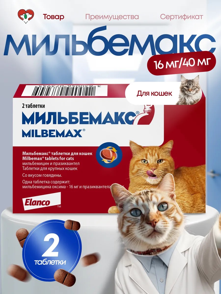 1 упаковка "Мильбемакс , таблетки от гельминтов со вкусом говядины для крупных кошек, 2 таблетки"