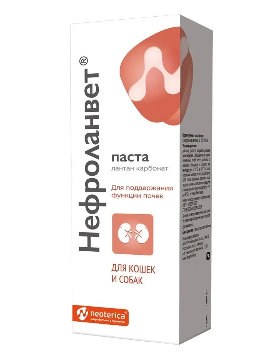 Нефроланвет паста – кормовая добавка для поддержания функции почек при хронической почечной недостаточности на основе лантана. У кошек и собаквстречаются разные патологии почек: гломерулонефрит, пиелонефрит, мочекаменная болезнь, опухоли, но конечной стадией каждой из них является хроническая почечная недостаточность – угасание функций почек и накопление продуктов жизнедеятельности организма в крови, что является причиной плохого самочувствия, сонливости, плохого аппетита, рвоты, жажды и снижения веса. Улучшает работу почек. Лантан связывает фосфор, что снижает рабочую нагрузку на почки. Останавливает развитие болезни. Регулярное применение пасты улучшает клиническое состояние животного. Безопасно. Лантан не всасывается в пищеварительном тракте и не оказывает негативного влияния. Вкусно. Аромат солода привлекает питомца и облегчает скармливание. Легко. Паста совместима со всеми кормами, лекарствами и другими кормовыми добавками. Дозировка: Применяют ежедневно, 1 раз в сутки из расчета 1 г пасты на 1 кг массы животного. Курс применения от 1 до 6 месяцев.