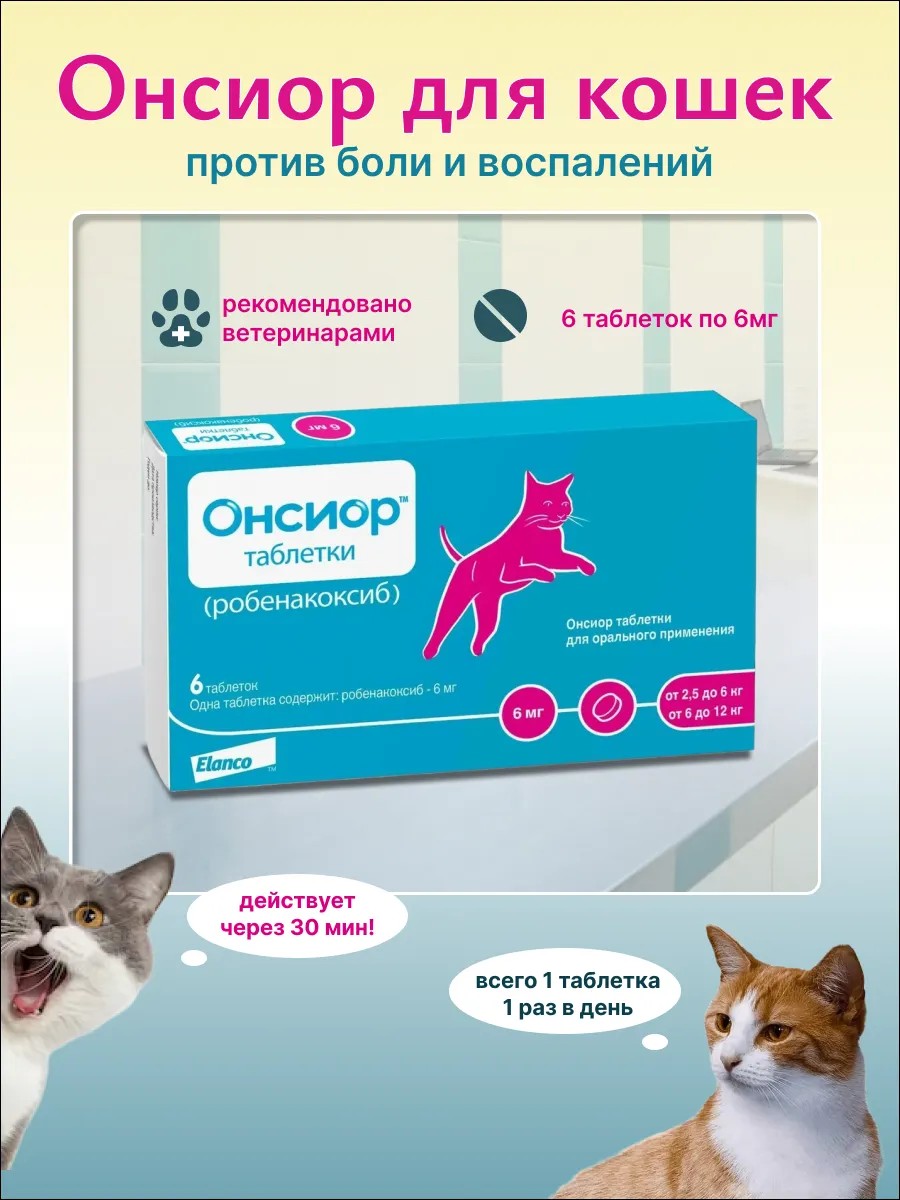 Onsior is used for cats weighing 2.5 to 6 kg once a day, 1 tablet, from 6 kg to 12 kg - 2 tablets.