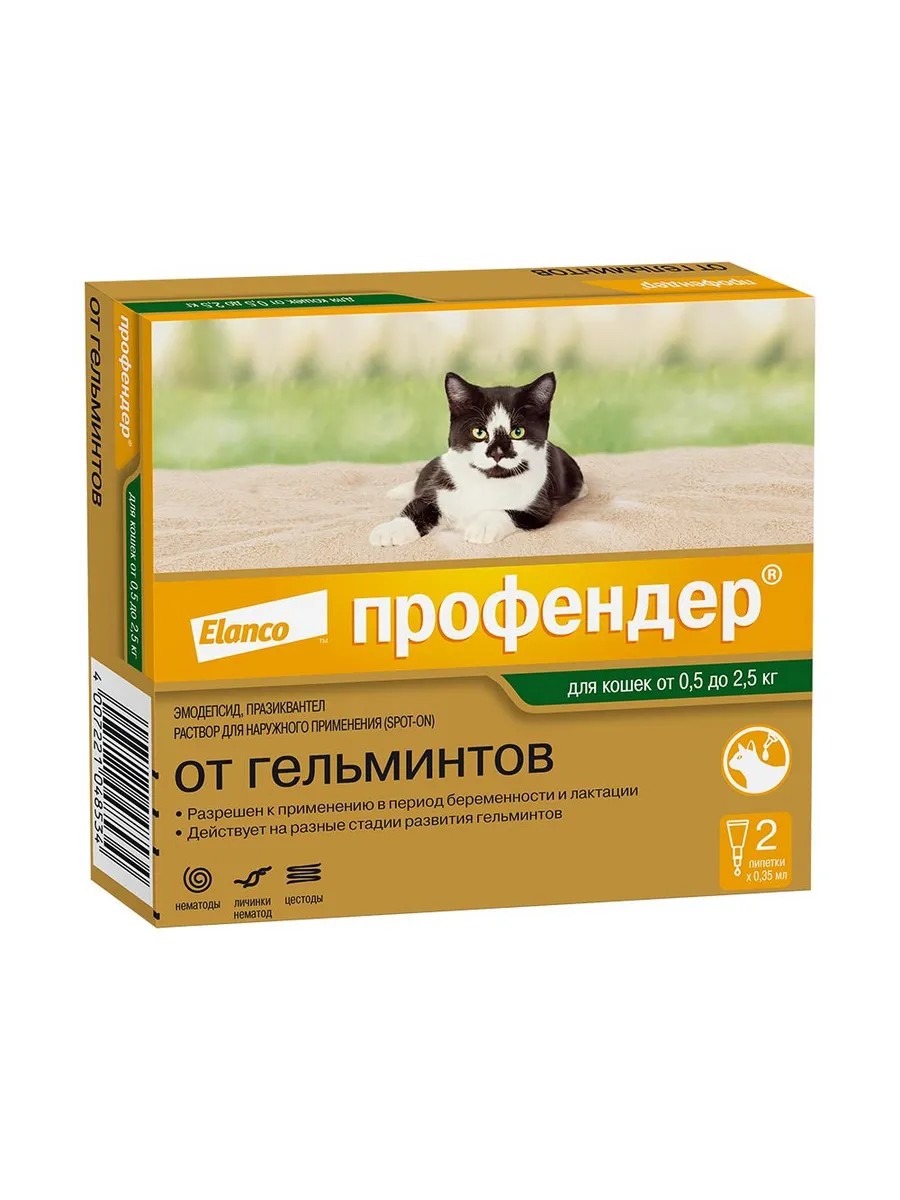 Профендер, капли на холку от гельминтов для кошек - новый взгляд на обработку кошек от глистов: помогает комфортно и без лишнего стресса избавлять вашего питомца от внутренних паразитов путем нанесения препарата на кожу в области основания шеи. Профендер имеет удобную дозировку по весу животного, его можно использовать котятам с 8-недельного возраста, беременным и кормящим кошкам. Препарат от компании Elanco, производится в Германии. Профендер – антигельминтик в виде капель на холку широкого спектра, действующий на: различные виды круглых кишечных гельминтов (токсокары, токсоскары, анкилостомы) – на их взрослые и личиночные стадии, в том числе и на мигрирующие по организму, взрослых особей круглых гельминтов (элюростронгилюсы), паразитирующих в легких и бронхах у кошек, различные виды ленточных гельминтов (дипилидии, тении, эхинококки). Преимущества: капли на холку от глистов для котят и кошек, широкий спектр действия – от самых распространенных видов глистов (круглых и ленточных) и против редких, но опасных видов – глистов, поражающих легкие и бронхи кошек, действуют на взрослых паразитов и на личинки, в том числе на мигрирующие по организму, обработка без стресса – капли в удобной пипетке для нанесения на холку, для котят и кошек весом от 500 г до 2,5 кг, разрешен котятам с 8-ми недель и/или 500 г веса, беременным и кормящим кошкам, срок годности 3 года, продукт компании Elanco, производится в Германии. Состав: эмодепсид и празиквантел. Эмодепсид действует на личинок (в том числе и на мигрирующих по организму) и взрослых особей круглых гельминтов, паразитирующих в кишечнике кошек, а также на паразитов в легких. Он парализует гельминтов, после чего они гибнут и выводятся из организма животного, что помогает избежать интоксикации продуктами распада паразитов. Празиквантел действует на ленточных гельминтов в кишечнике, приводя к их гибели. 1. Препарат следует наносить на сухую неповрежденную кожу. 2. Перед использованием проколите защитную мембрану пипетки, надев колпачок с обратной стороны. 3. Раздвиньте шерсть, пока не станет видно кожу. 4. Нанесите содержимое пипетки непосредственно на кожу: выдавите полную пипетку непосредственно на кожу между лопатками у основания шеи. Обработку от гельминтов с лечебной целью проводят однократно. Обработку от гельминтов с профилактической целью проводят ежеквартально. Для лечения элюростронгилеза (взрослые стадии легочных Aelurostrongylus abstrusus) препарат следует применять двукратно с интервалом 14 дней. В целях предотвращения передачи личинок Toxocara cati через молоко от матери котятам проводят однократную обработку беременной кошки примерно за семь дней до предполагаемой даты poдов. Фармакологическое действие: Эмодепсид, входящий в состав препарата, активен в отношении личинок (в том числе мигрирующих по организму) и взрослых особей круглых глистов, паразитирующих в желудочно-кишечном тракте у кошек, а также в отношении взрослых особей легочных гельминтов. Вызывает паралич и гибель паразитов. Празиквантел активен в отношении желудочно-кишечных ленточных гельминтов на всех стадиях развития. Он вызывает нарушение мышечной иннервации, паралич и гибель паразитов. Противопоказания: повышенная индивидуальная чувствительность животного к компонентам препарата. Не следует применять котятам моложе 8-недельно