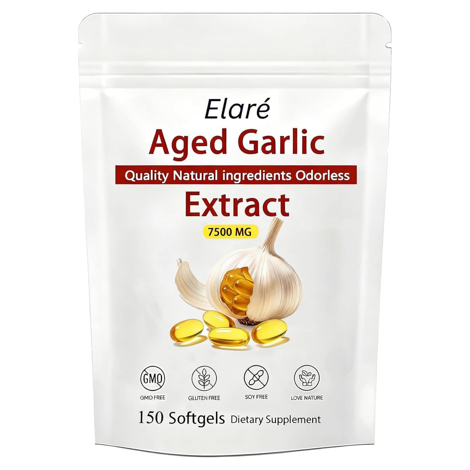 Elare Aged Garlic Extract - 7500mg Odorless Organic Garlic Extract Capsules | Heart & Immune Antioxidant Supplements Vegetarian All-Natural Non-GMO 150 Softgels(1 PCS)