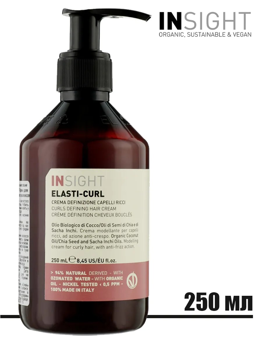 Моделирующий крем Insight Elasti-Curl Curls defining hair cream с эффектом anti frizz (антифриз) для кудрявых и вьющихся волос. Помогает сделать локоны четкими и упругими, при этом легкими и эластичными даже при сильной влажности. Не оставляет следов и не утяжеляет волосы. Активные ингредиенты: органическое масло кокоса, семена чиа и масло сача инчи. Крем для укладки кудрявых волос Curls Defining Hair Cream – это моделирующий крем с эффектом «anti-frizz» для кудрявых и вьющихся волос. Идеально подходит для выделения волн и локонов даже во влажном климате. Обогащен фито-маслами, которые сохраняют увлажненность волос во время укладки, помогая создавать четкие и упругие локоны, при этом легкие и эластичные даже при сильной влажности. Не оставляет следов и не утяжеляет волосы. Идеально подходит для всех типов вьющихся волос, от категории 2 до 4: волнистые, вьющиеся или афро-текстурированные волосы. Преимущества: - фиксация локонов; - усиление завитка. Активные ингредиенты: - фиксирующие компоненты; - позволяют долго сохранять форму кудрей; - органическое масло кокоса, масло семян чиа и масло сача инчи; - обладают питательным и кондиционирующим эффектом. Применение: - после мытья волос увлажняющим шампунь-воском для кудрявых волос нанести небольшое количество продукта на ладони; - распределить по влажным волосам прядь за прядью; - затем приступить к укладке на воздухе или феном с диффузором; - крем также можно использовать после высыхания, чтобы определить детали.