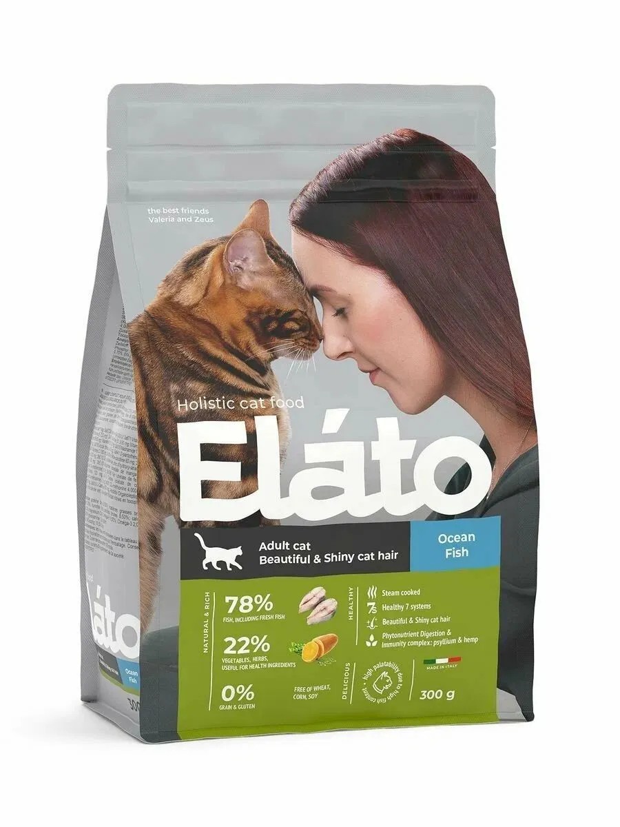 Dry food for cats Elato Holistic for beautiful and shiny coat Fish 300g. Adult Cat Ocean Fish / Beautiful & Shiny Cat Hair. Complete food for adult cats with fish. Elato food contains active substances to maintain the health of 7 important systems and organs of the cat, which helps prevent diseases:. ! digestive system prebiotics inulin, FOS and MOS, psyllium. ! cardiovascular system - taurine, antioxidants. ! bones and teeth - minerals (including calcium and phosphorus), vitamin D3. ! joints - chondroprotectors glucosamine and chondroitin. ! skin and coat - essential fatty acids of the Omega-3 class, B vitamins, biotin. ! immune system - vitamins, hemp seed. ! eyes - vitamin A, antioxidants, taurine. . Elato food contains a complex of special phytonutrients that reduce the consequences of the negative impact of the ecology of large cities and are aimed at general strengthening, cleansing and antioxidant protection of the body:. ! Psyllium improves the functioning of the stomach and intestines, facilitates the absorption of nutrients, normalizes the intestinal microflora, removes toxins and slags from the body. ! Hemp strengthens the immune system, is used to prevent allergic diseases. ANALYTICAL COMPOSITION. Crude protein 38.00%; crude fat 17.00%; crude fiber 1.80%; moisture 8.00%; crude ash 8.50%; calcium 1.60%; phosphorus 1.20%; magnesium 0.09%; Omega-6 1.00%; Omega-3 2.00%; DHA 0.70%; EPA 0.80%; Glucosamine 1000 mg/kg. Energy value: 3940 kcal/kg; 16.50 MJ/kg. Special additives: rosemary extract, green tea extract. Antioxidants: tocopherol-rich extracts of natural origin. Ingredients: Dehydrated fish (58%), fresh fish (20%), whole green peas, sweet potato, fish oil (herring oil), vegetable fiber, inulin, psyllium, brewer's yeast, fructooligosaccharides, aloe vera powder (0.1%), glucosamine, turmeric, cloves, lemon fiber (0.05%), yucca schidigera juice.