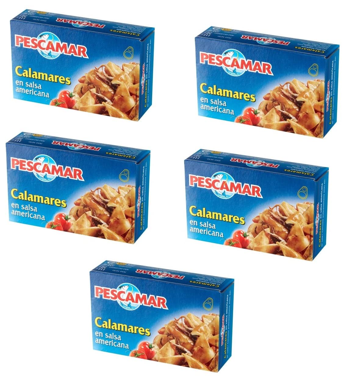 Elazvibes - Calamars en Sauce Américaine - Poulpe, Calamares, Aliment Fin pour Salade, Antipasti, Pâtes Sandwichs - 5 Boites de 111g