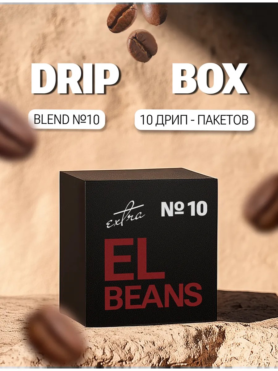Discover the refined taste and aroma of premium drip coffee Elbeans Blend №10. br/br/This unique blend of high-quality Arabica and Robusta will give you unforgettable pleasure with every cup. br/br/The specially designed drip coffee format will provide you with convenience and ease of preparation, no matter where you are. br/br/Each package contains 10 drip bags, which makes this coffee an ideal choice for both home and office. br/br/Convenient packaging with dimensions of 95x110x130 mm and a weight of only 250 g will easily fit in your cupboard or on a kitchen shelf. br/br/Enjoy the rich flavor and invigorating caffeine that will give you a boost of energy for the whole day!br/br/Elbeans Blend №10 is made in Russia according to strict quality standards and does not contain GMOs, artificial flavors or additives. This is a completely natural product, suitable for vegetarians and those who follow dietary standards. Store this amazing coffee in conditions not exceeding 20°C and enjoy its freshness all year round.br/br/Immerse yourself in a world of rich flavor and sophisticated aroma with Elbeans Blend №10 drip coffee bags. This product will be a great companion for your morning or break during the day, offering you not only pleasure but also health care thanks to the vitamins it contains. Choose the best for you and your loved ones!