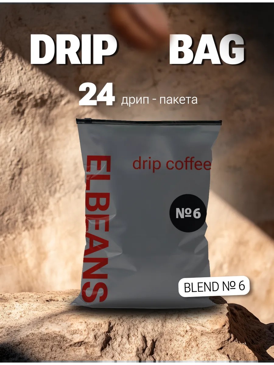 Discover the refined taste and aroma of premium Elbeans Blend No. 6 drip coffee. br/br/This unique blend of high-quality Arabica and Robusta will give you unforgettable pleasure with every cup. br/br/The specially designed drip coffee format will provide you with convenience and ease of preparation, no matter where you are.br/br/Each package contains 24 drip bags, making this coffee an ideal choice for both home and office. br/br/Enjoy the rich flavor and invigorating caffeine that will give you a boost of energy for the whole day!br/br/Elbeans Blend №6 is made in Russia according to strict quality standards and does not contain GMOs, artificial flavors or additives. This is a completely natural product, suitable for vegetarians and those who follow dietary standards. Store this amazing coffee in conditions not exceeding 20°C and enjoy its freshness all year round.br/br/Immerse yourself in a world of rich flavor and sophisticated aroma with Elbeans Blend №6 drip coffee bags. This product will be a great companion for your morning or break during the day, offering you not only pleasure but also health care thanks to the vitamins it contains. Choose the best for you and your loved ones!