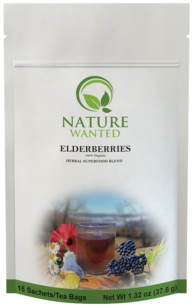 Adds a mix of delicious ingredients including cinnamon, ginger, turmeric root, licorice root, hibiscus, and chamomile. Wild elderberries harvested in Ukraine. Product produced in the U.S. Each Pouch Contains 15 ct Tea Bags filled with Delicious Elderberry and Superfood Blend.