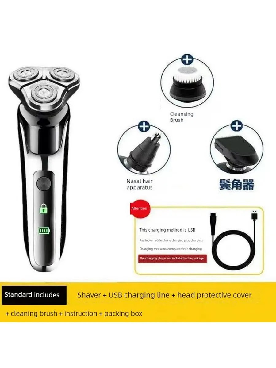 Электробритва с тремя лезвиями (классическая 3-лезвийная + триммер для носа + триммер для бакенбард + очищающая щетка)