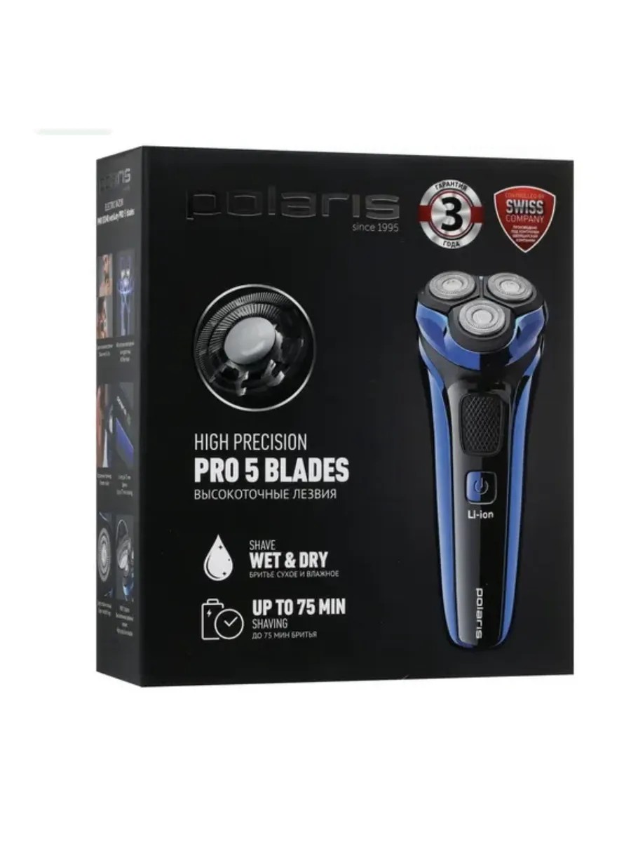 The Polaris PMR 0304R PRO 5 rotary electric shaver features an ergonomic blue body with a wide handle. Its movable blade and three pivoting heads follow the contours of your body, cutting even the finest hairs.