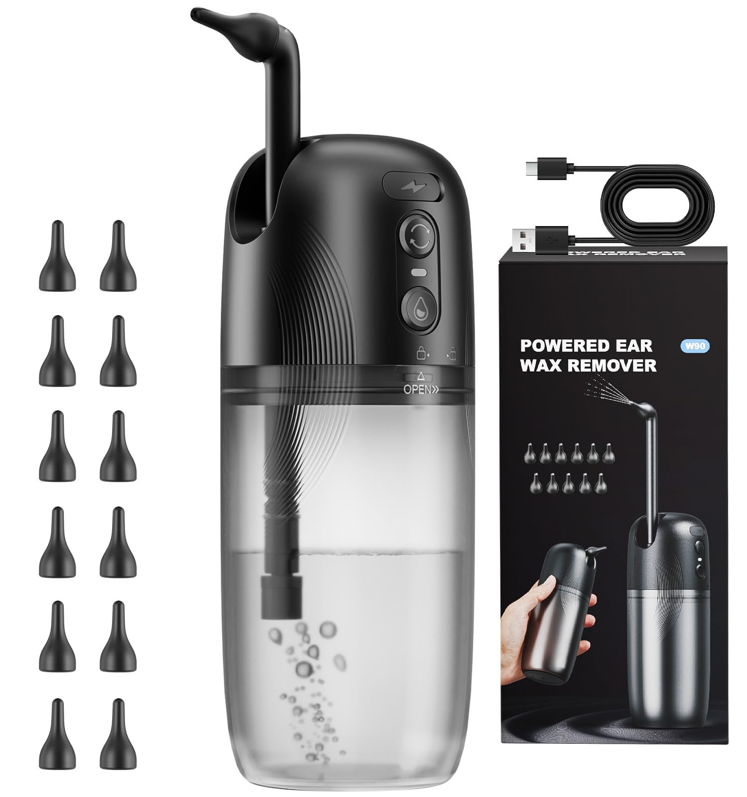 How to Use: For optimal results, we recommend using lukewarm water, avoiding extreme temperatures that may cause discomfort. Fill the device with up to 230ml of water and extend the retractable nozzle to its maximum length for effective ear irrigation. Portable and Convenient: Our ear cleaning kit is compact and features a retractable design, making it easy to carry and store. Perfect for home use or travel, ensuring you can maintain ear hygiene anytime, anywhere.12 interchangeable silicone tips, our ear cleaner tool provides customized ear care to accommodate different user preferences and needs. USB Charging: Our ear care products come with USB charging, ear care products fully charges in just 2.5 hours, this ear cleaning tool offers long usage time and hassle-free recharging, ensuring you always have a reliable ear irrigation system at your fingertips. IPX7 Waterproof: Our Ear Wax Removal Kit features IPX7 waterproof technology. It effortlessly withstands intense water sprays and copious splashes, guaranteeing dependable protection throughout usage. You can utilize it in the shower with absolute confidence, assured that it will remain unscathed by water contact. 3 Adjustable Modes: Ear cleaner with 3 adjustable modes, Low, Pulse, High. Low speed mode meets the daily cleaning Strong mode is for those who need to deep clean their ears Pulse mode through the rhythmic water flow, deep into all corners of the ear canal, to achieve a comprehensive cleaning. Safe Effective Ear Wax Removal: Yakbio electric earwax remover kit is designed for safe and efficient ear cleaning, experience a safe, efficient, and gentle solution for cleaning your ear canal, helping you maintain optimal ear hygiene without. Say goodbye to ordinary methods and hello to a more hygienic solution!.
