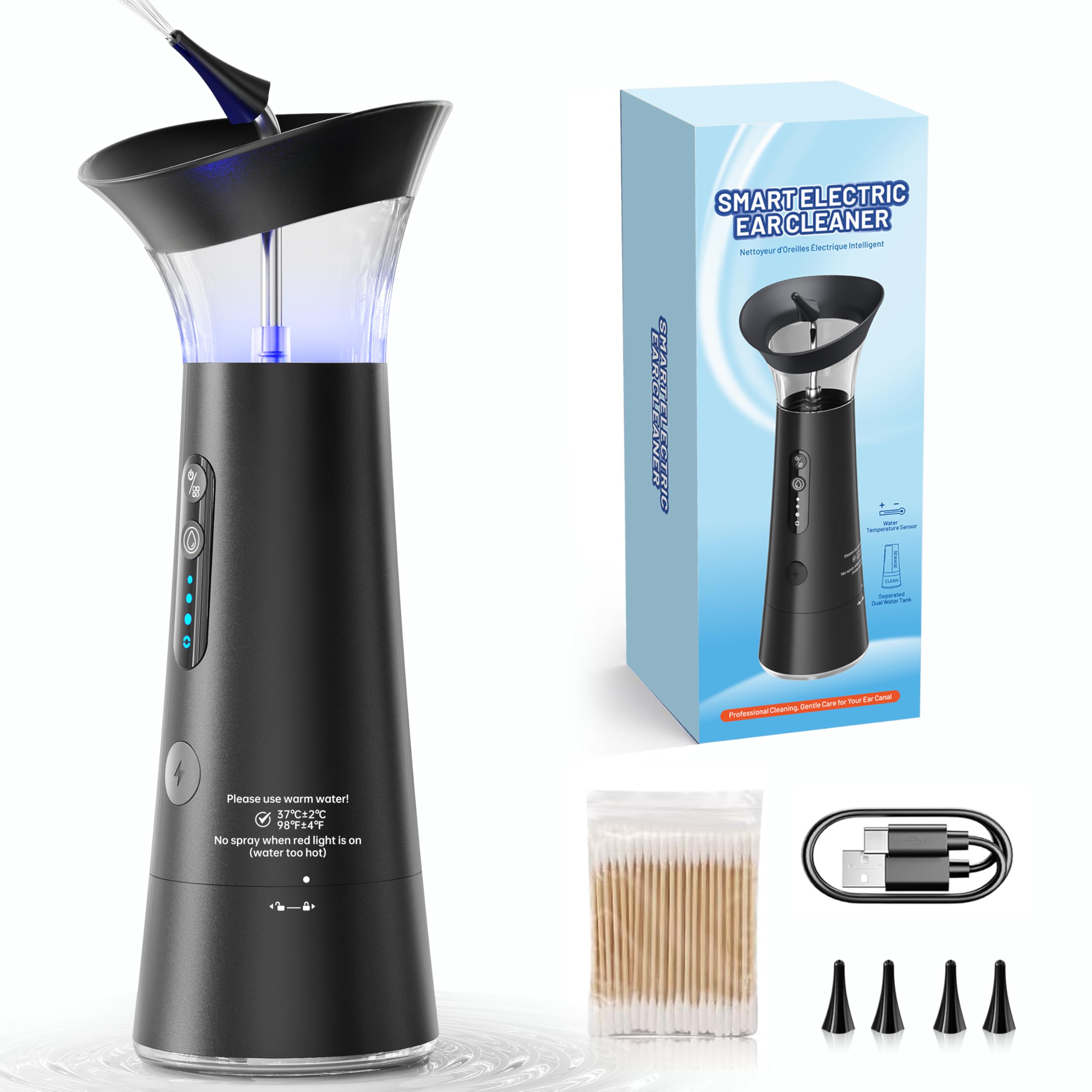 IPX6 Waterproof: Safely use it during shaowers for convenient ear wax removal or rinse the entire unit directly under running water after cleaning. The sealed components prevent moisture damage while enabling effortless maintenance. Smart Temperature Control For Safer Ear Care: Experience worry-free ear irrigation with our intelligent triple-safety system. Advanced sensors continuously monitor water temperature, automatically stopping operation and activating a red warning light if exceeding 102 F (39 C) to prevent ear canal burns. The green indicator confirms ideal 95-102 F (35-39 C) warmth for gentle ear wax removal, while a blue light signals cooler temperatures preferred by sensitive users. This precise thermal management ensures consistently comfortable and efficient ear cleaning. Four Pressure Modes: Tailor your ear cleaning experience with specialized flow settings designed for different needs. The Soft Mode provides gentle irrigation perfect for children and sensitive users, while Normal Mode handles daily maintenance effortlessly. For stubborn buildup, Strong Mode offers enhanced cleaning power, and the unique Pulse Mode delivers a massaging action that promotes thorough ear wax removal without discomfort. Separated Dual Tank System: Experience hospital-grade hygiene with our innovative dual-tank ear cleaner. The isolated clean water tank and waste water tank ensure zero bacterial mixing, eliminating infection risks during ear wax removal. Simply detach the transparent waste tank for easy disposal, making your ear cleaning routine safer and more sanitary than traditional single-chamber devices. Ergonomic Nozzle Design: Our upgraded 126 angled nozzle revolutionizes ear irrigation: No more tilting your head sideways! Sit stand naturally while directing water flow upward into ear canals. Eliminates neck strain and dizziness from awkward positions – making ear wax removal 50 more comfortable. Finally, stress-free ear care!.