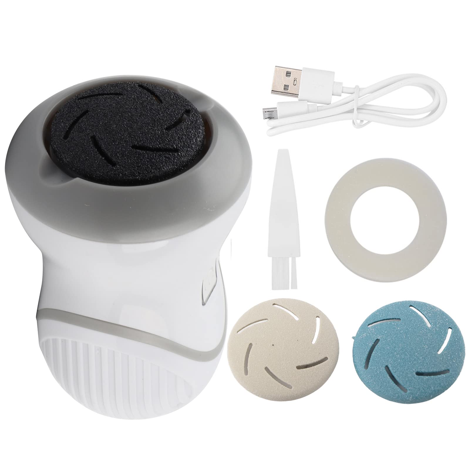 Specification: Item Type: Electric Foot Grinder Built-In Battery: Lithium Battery 950mAh Charging Time: DC 5V Charging Current: 2A Rated Voltage: 3.7V Rated Power: 2.5W Use Time: 50min Size: Approx. 10.5 x 6.6 x 5.4mm 0.4 x 0.3 x 0.2inch Low Level Speed: About 1600 rpm High Level Speed: About 1700 rpm Product Features: Safe foot protection, long-lasting battery life, USB charging, exfoliating calluses, automatic absorption of dander, adjustable speed. Package List: 1 x Host (With 1 Dark Sanding Head) 1 x Gray Sanding Head 1 x Blue Sanding Head 1 x Filter Sponge Clamp Circle 1 x USB Charging Cable 1 x Manual 1 x Clearing Brush Note: 1. Completely soak your feet first to soften the keratin: Soak your feet in warm water for about 10 minutes. If the calluses are thick, use 2-3 spoons of white vinegar hot water to soak your feet. Keep your feet dry before using. 2. Exfoliation should not be too frequent: use 1-2 times a week. It is not recommended to polish all dead skin calluses at once. 3. Please completely charge it for the first use. 4. The body is not waterproof and cannot be washed. 5. Please note that the new type and old type of this product will be sent randomly, and make sure you will not mind before ordering. SAFETY WARNING Keep the body dry, exfoliate 1-2 times a week, and note that the new and old types of the product will be sent randomly.[Exfoliation Should Not Be Too Frequent]: Use 1-2 times a week. It is not recommended to polish all dead skin calluses at once. Keep your feet dry before using. [USB Charging]: Electric foot grinder is easy to charge, 1.5h fast charge, 50min long battery life, strong power, and more comfortable to use. Please completely charge it for the first use. [Exquisite Craftsmanship]: Foot hard skin remover with exquisite craftsmanship, the details of this product is trictly controlled to help you polish your skin comfortably, safe foot protection. [Easy to Use]: Electric foot grinder is used to exfoliating calluses, which can automatic absorption of dander, the head can be detached and cleaned to better keep the body hygienic. [Adjustable Electric Foot Grinder]: Electric foot grinder adopts vacuum clearing system and high-speed centrifugal rotating dust collection. The speed can be adjusted in two gears, which is suitable for different users.