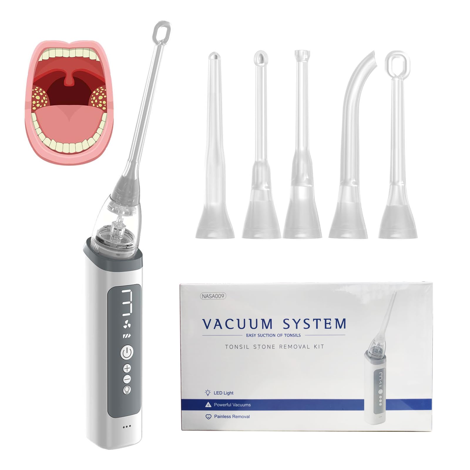 Gentle Tonsil Stone Remover Constructed from BPA-Free Silicone ABS Plastic - A Secure Comfortable Cleaning Instrument. Rapid USB-C Charging Extended Battery Life 2W high-efficiency system Complete charge within 2.5 hours 700mAh premium battery Multi-mode runtime (Eco:120min Standard:110min Maximum:100min) Housed in a sleek, cord-free design ideal for travel and daily care. LED Light Ergonomic Non-Slip Grip Equipped with an integrated clear LED light for enhanced visibility, plus an ergonomic ABS handle crafted to resist slipping-even with damp hands. Its streamlined, lightweight build rests comfortably in your palm, enabling effortless at-home use. ? 3 Customizable Suction Intensities Soft (for sensitive throats), Standard (routine use), and Maximum (for persistent debris) modes to tailor your cleaning experience. Tonsil Stone Removal Kit Electric suction tool featuring 5 attachments, customizable power settings built-in LED illumination - A secure, reusable solution for throat comfort, Eliminate Frequent Clinic Trips - Cut Costs by 200 Annually.