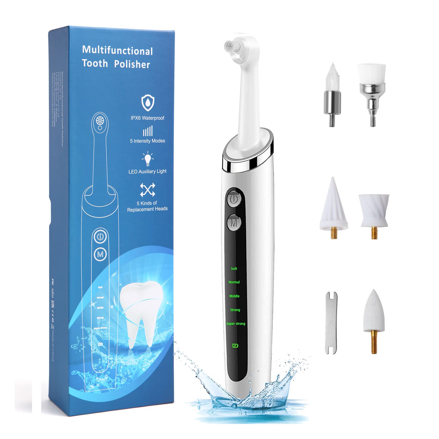 Packing List *1 x User manual *2 x Polishing Cup Head *1 x pointed Brush Head *1 x Umbrella Polishing Cup Head *1 x Silicone Rub Head *1 x Flattop Brush Head *1 x Wrench 1 x USB Charging Cable (Type-C) Specifications Charging *Voltage: 5V *Charging Current: =1A *Charging Time: 2-3 Hours *Power consumption: <3W *Net Weight (about): 146g *Size: 1.4 x 1.2 x 8.3 inch *Charging Way: USB (Type-C) 2.5 Hours Fast Charging *Plaque remover for teeth is Type-C socket USB charging, can be applied to rechargeable batteries, car, PC side charging, charging once 2.5 hours, can be used more than 10 times. IPX6 Waterproof *It's shell is with IPX6 grade waterproof function, the handle will not be damaged with water (can not be immersed in water) Stay Away From Plaque and Stain *The unique design easily removes stubborn stains, flat stains, and interdental stains from teeth, making teeth smoother and shinier.?100% Product Guarantee?We provide customer service at any time, reply to emails within 24 hours, if you have any questions, please contact us, we are happy to answer any questions you have and bring you satisfactory service. ?IPX6 Waterproof?- It comes in a fully sealed package for easy cleaning and continuous use, can be rinsed under running water (can not be immersed in water), safe and convenient. ?USB Rechargeable?- The teeth cleaning kit is equipped with a Type-C interface, which can be charged with a power bank and PC, and can be used more than 10 times on a single charge, making it easy to carry at home and travel. ?Built-in LED Light?- It is designed with LED searchlight, combined with ergonomic design to clean all corners of your teeth with maximum efficiency. ?5 Adjustment Modes? - It is equipped with five gears (soft, normal, medium, strong, super strong) to adapt to different gum sensitivities and meet different needs. ?5 Replaceable Brush Heads?- The tooth polisher is equipped with 5 replaceable polishing heads, which act on different surfaces of the teeth and effectively clean the stains.Best Sellers Rank: See Top 100 in Health & Household. Included Components: Coating Tool. Number of Items: 1. Item Form: Strip. Product Benefits: Whitening. Brand: VAKAR. Country of Origin: China. : B0BMCMMFZ8. Manufacturer: VAKAR. Date First Available: November 16, 2022. Batteries: 1 Lithium Ion batteries required. (included). Package Dimensions: 9.72 x 3.5 x 1.69 inches; 10.23 Ounces.