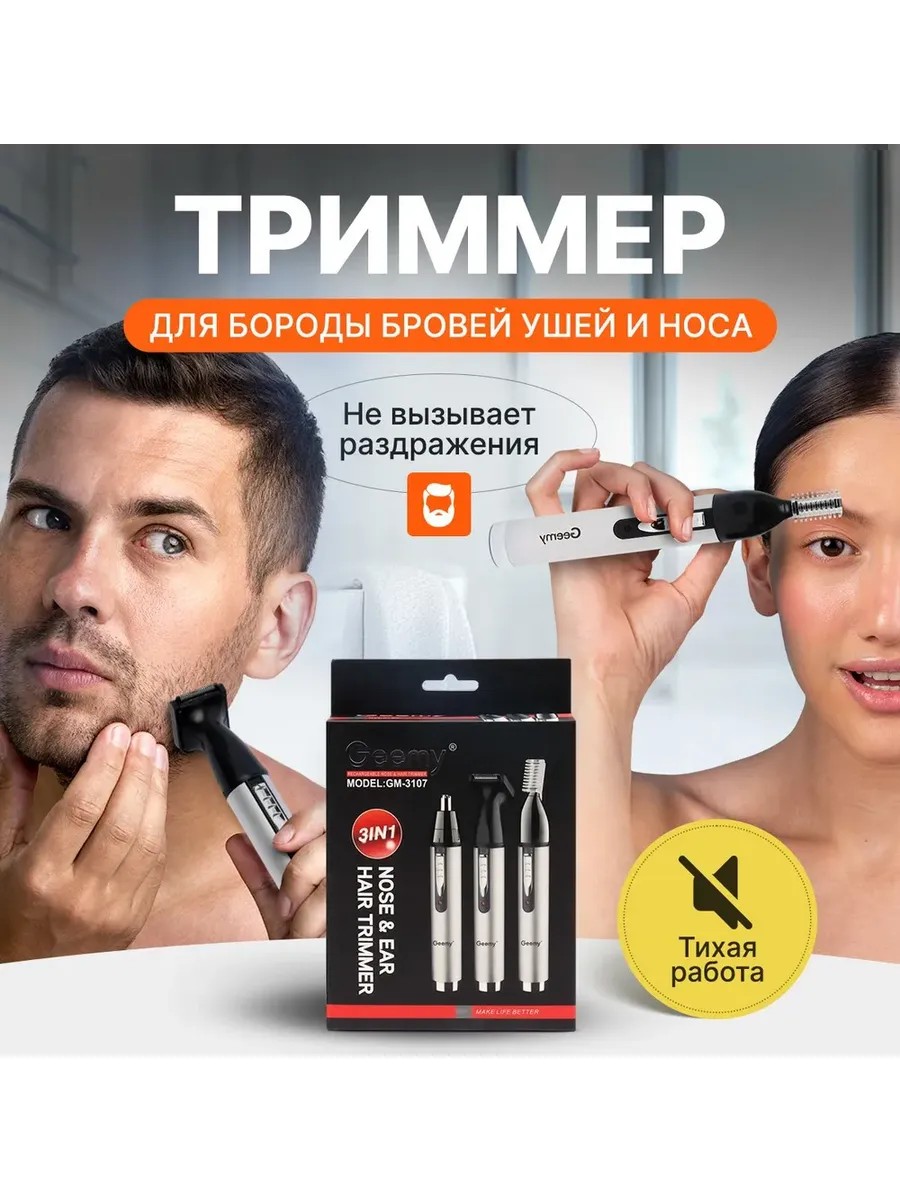 Электротриммер - бритва Geemy 3в1 с тремя насадками для удаления и стрижки волос из носа и ушей бровь лица и тела, для стрижки и окантовки подбородка, усов на лице отличная замена бритва для носа. Триммер - машинка для бровей могут использовать как мужчины, так и женщины как аксессуар. Данный стайлер - машинка относится к бытовой технике по уходу за телом и может использоваться как для бритья и чистки лицевой части тела, так и интимных мест, одной из которых является зона бикини. Электрическая бритва имеет встроенный аккумулятор 3500 mA/ч , что позволяет использовать ее в течении 60 минут. Время зарядки около 6 часов. Универсальный электробритва не имеет открытых лезвий, что делает ее безопасной. Корпус сделан из металла и имеет серебристый цвет. В набор входят: электро тример, шнур (провод) для зарядки, три моющиеся насадки, кисточка для очистки, и расческа в подарок. Упаковано в фирменную коробку + упаковка для надежной транспортировки до клиента. Для очистки - необходимо снять насадку и почистить ее кистью или под проточной водой. Товар из категории красота и здоровье будет прекрасным подарком на любой праздник!