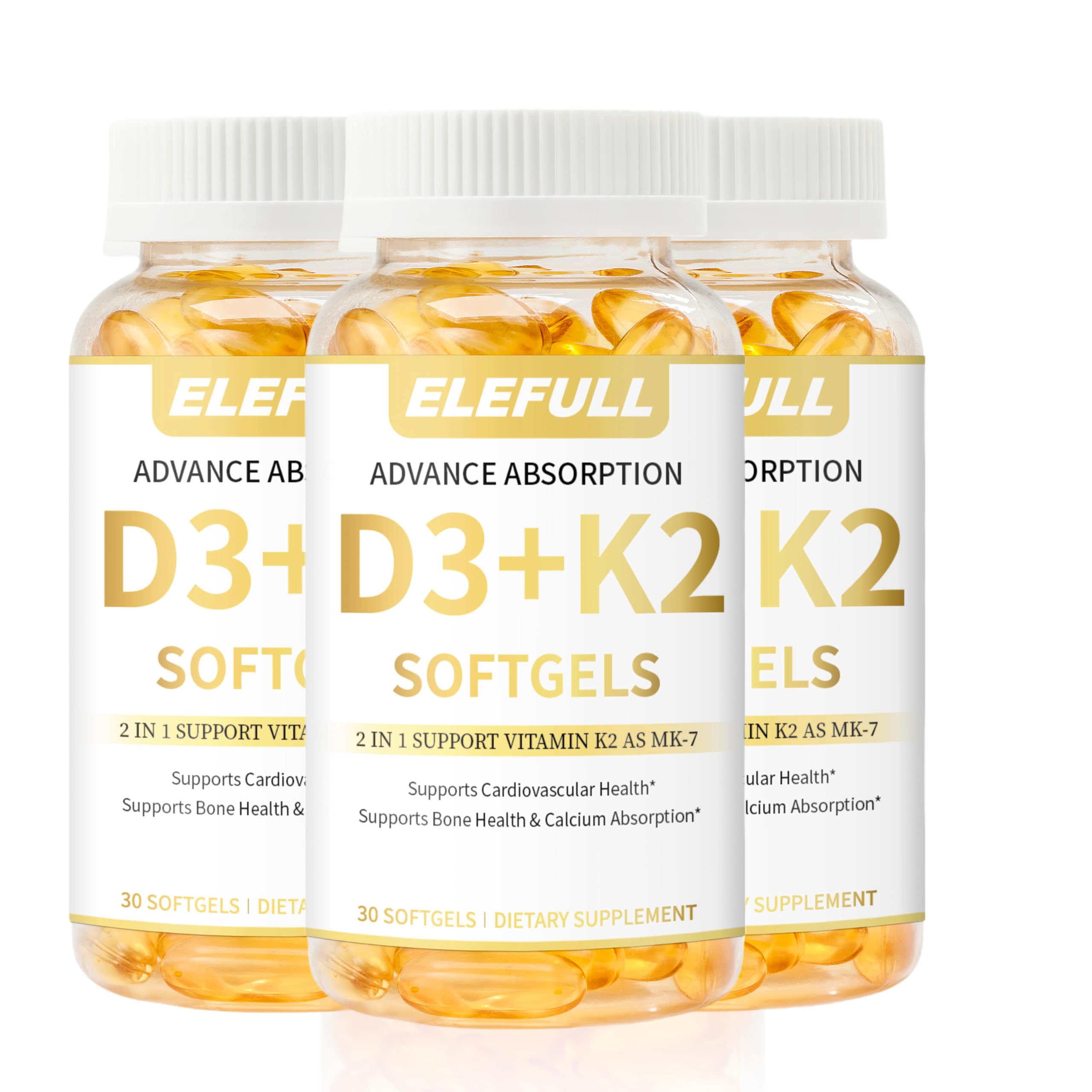 elefull 3-Pack (Factory Direct Wholesale) Vitamin D3 + K2 w/Coconut Oil - Vegan Vitamin D 5000iu & Mk7 Vitamin K 100mcg for Bone & Immune Support - Vegan Certified Non-GMO Soy Free - (60X3)