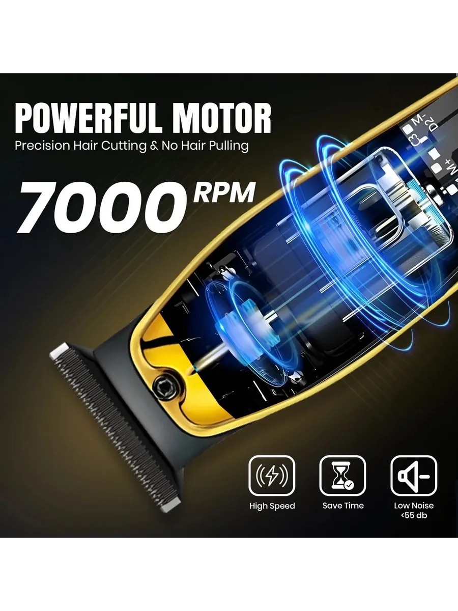 Discover our modern hair trimmer, featuring a stylish gold design. It's the perfect tool for both home and professional use, combining high power and precision. Its ergonomic shape and quiet operation make creating a variety of hairstyles easy and comfortable. It features sharp stainless steel blades for a precise cut, even on the finest hair. A multifunctional attachment set allows you to easily adjust the cutting length, making the process as convenient and safe as possible. Its compact size and long battery life make it perfect for travel and use whenever you need it. Its reliable quality and modern design make this trimmer an excellent choice for those who value style and professionalism in hair care.