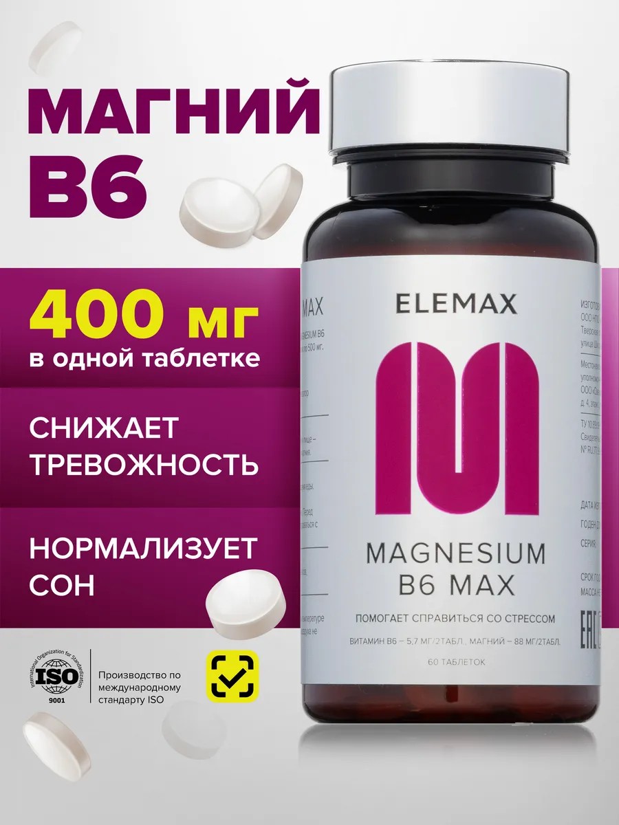 Magnesium B6 Max — комбинация магния и витамина В6 в таблетках. Действие биологически активной добавки направлено на защиту от стресса и повышенной тревожности. Прием БАД улучшает работу центральной нервной системы, способствует здоровому сну, снижает беспокойство. Магний — значимый минерал как по функциям, так и по содержанию в организме человека. До 53% магния концентрируется в костной ткани, дентине и эмали зубов, 20% — в тканях с наиболее высокой метаболической активностью (мозг, сердце, мышцы, почки, печень). В организме человека около 20–28 г магния. Большая часть сконцентрирована внутри самих клеток, где это второе по значимости минеральное вещество после калия. Около 1% магния содержится в крови, это природный антагонист кальция и регулятор сосудистого тонуса, артериального давления и периферического кровообращения. Уровень магния в сыворотке крови и внутриклеточное содержание магния не дают верного представления о его физиологической активности и не отражают точных запасов в организме, то есть возможен скрытый дефицит магния.