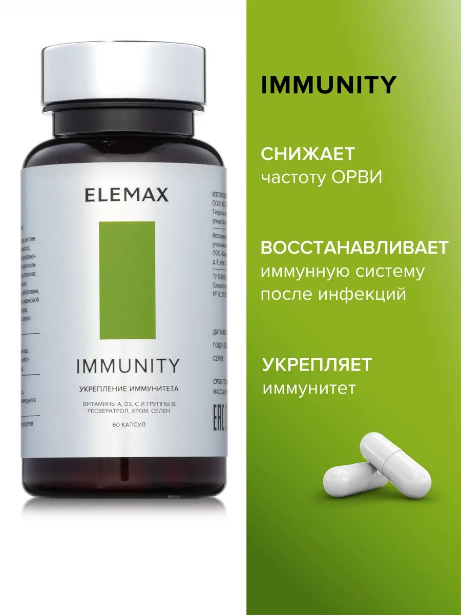 Elemax Immunity — комплекс аминокислот, минералов, витаминов в капсулах, разработанный для укрепления иммунитета. Сбалансированный состав подходит для взрослых женщин и мужчин. Прием БАД способствует восстановлению и повышению иммунной защиты организма. Cостав. Глицин участвует в цитопротекции (особенно клеток мозга, печени, почек), иммунном ответе, метаболизме. Повышает умственную работоспособность, нормализует сон и психоэмоциональное состояние. Витамин А оказывает антиоксидантное действие, усиливает активность иммунной системы. L-цистеин — предшественник глутатиона; это вещество обеспечивает защиту клеток печени и головного мозга от повреждения алкоголем, лекарственными препаратами и токсинами. Антиоксидантную активность L-цистеина усиливает совместный прием с витамином С и селеном. Бетаин препятствует осмотическому стрессу, что особенно важно для здоровья почек и печени. Участвует в модуляции иммунного ответа, поддерживает оптимальную проницаемость кишечника. Витамин С (аскорбиновая кислота) — эффективный антиоксидант, кофермент для множества реакций в организме и синтеза различных веществ. Усиливает естественную защиту организма, ускоряет заживление тканей. Регулирует работу лейкоцитов и апоптоз клеток, влияет на фагоцитоз и уничтожение бактерий, сдерживает воспаление. Оказывает противовирусное действие: установлено, что высокая доза витамина С (500 мг vs 50 мг) снижает частоту ОРВИ на 70%. Ресвератрол обладает антиоксидантными, противомикробными, противовирусными и заживляющими свойствами, тормозит избыточное воспаление в острой и хронической фазе. L-глутамин играет ведущую роль в метаболизме азота, белков и энергии, развитии иммунных клеток и восстановлении тканей, регуляции уровня глюкозы и С-реактивного белка. Магний — важнейший минерал для нервной, эндокринной, иммунной систем, в состав комплекса входит в биодоступной форме цитрата. Марганец участвует в синтезе белков, меланина, дофамина, жирных кислот, способствует увеличению плотности костей. Витамин В1 снижает риск развития нейропатии, катаракты. Витамин В2 участвует в метаболизме других витаминов группы В (В3, В6, В12), необходим для усвоения железа, снижает интенсивность приступов мигрени, риск возрастной катаракты и нейродегенерации. Витамин В3 участвует в метаболизме углеводов, необходимом для обеспечения организма энергией, а также в синтезе аминокислот, белков, нейротрансмиттеров, жирных кислот, липидов, функционировании гормональной системы. Витамин В5 ускоряет заживление ран. В организме существует в виде коэнзима А, необходимого для синтеза жиров, холестерина и стероидных гормонов, ацетилхолина, мелатонина. Витамин В6 (пиридоксин) — незаменимый кофермент для синтеза и функционирования многих нейротрансмиттеров, включая гамма-аминомасляную кислоту, серотонин, дофамин, норадреналин, гистамин, глицин, d-серин. Поддерживает иммунную систему, предупреждает развитие когнитивных нарушений, оказывает антидепрессивный эффект, применяется в комплексном лечении неврологических болевых синдромов. Витамин В12 необходим для полноценного усвоения фолиевой кислоты, оптимального функционирования сердечно-сосудистой системы. 5-гидрокситриптофан (5-htp) необходим для синтеза нейромедиаторов серотонина и мелатонина. Оказывает противотревожный и антидеп