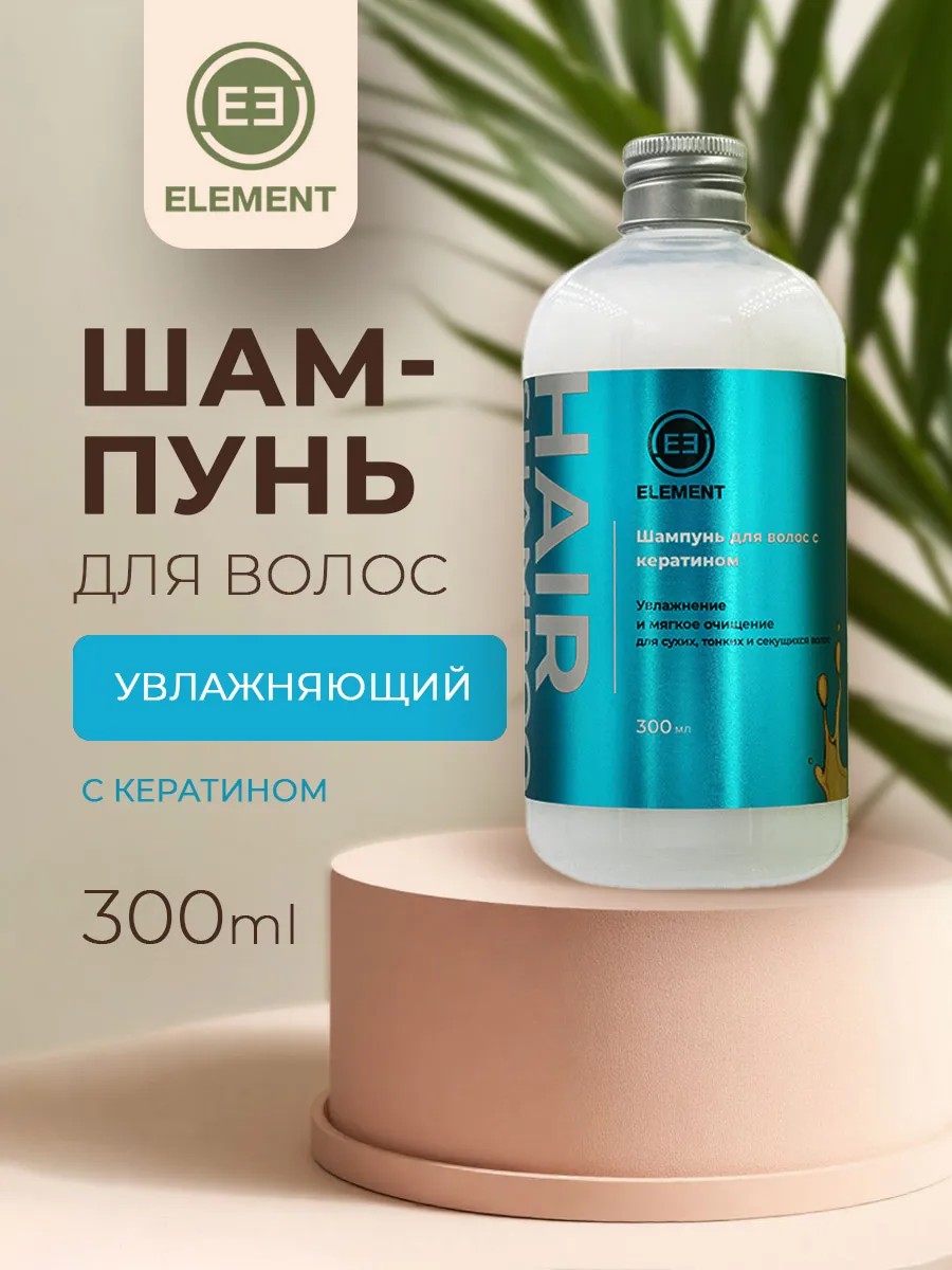 Element Шампунь для волос увлажняющий с кератином 300 мл.Шампунь для волос увлажняющий с кератином Element мягко очищает волосы и кожу головы, значительно улучшает их состояние, помогает восполнить недостаток собственного кератина. Кератин проникает в структуру волос и заполняет возникшие из-за повреждений пустоты, делает их более сильными, упругими, блестящими и шелковистыми без утяжеления. Оптимальный уровень рН средства подходят для естественной кислотной среды кожи головы и всех типов волос, особенно для сухих, тонких и секущихся.Применение:Нанести шампунь на влажные волосы, вспенить и помассировать, затем смыть теплой водой.