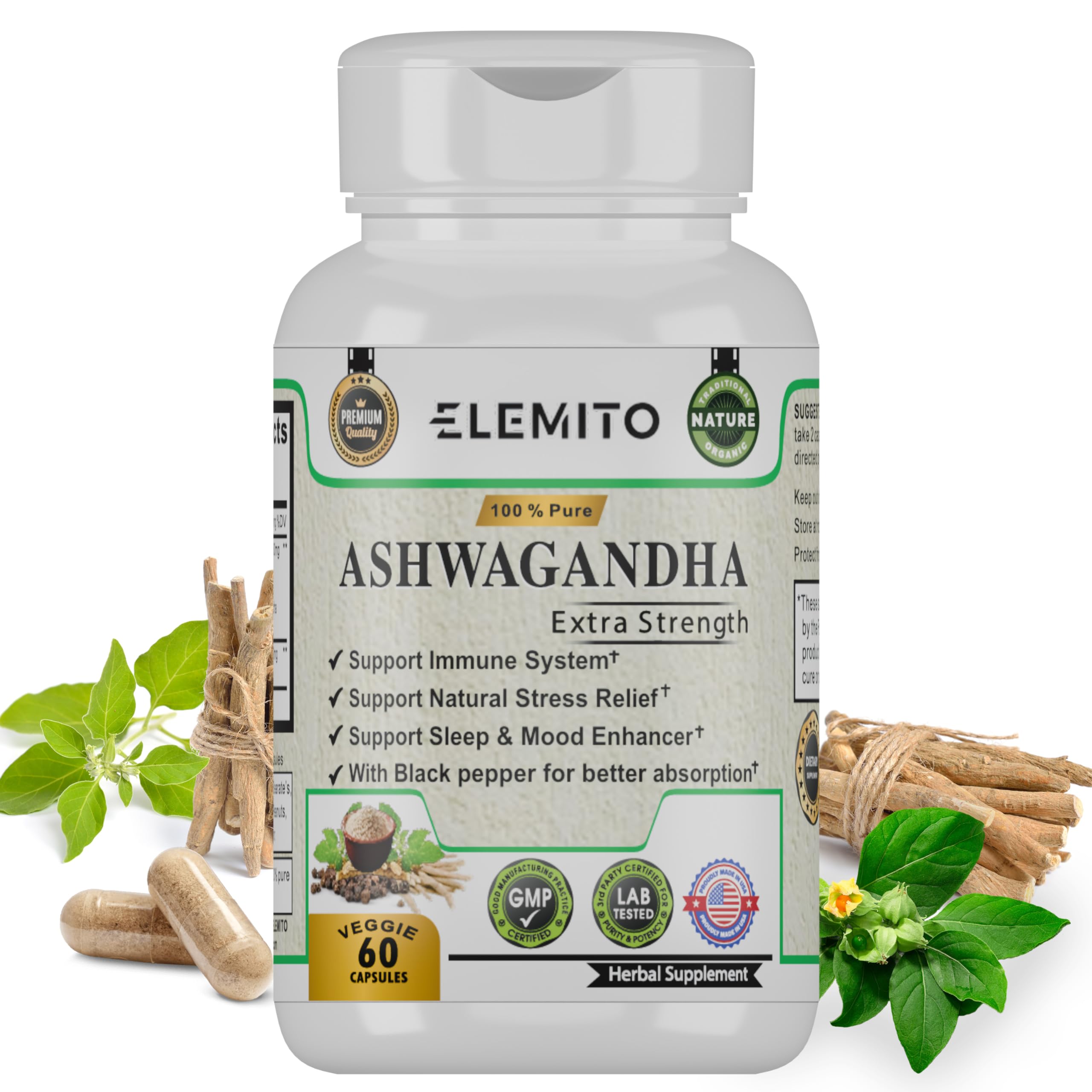 ELEMITO Ashwagandha Extra Strength Supports Mood Energy Vitality & Strength Pure Organic Non-GMO Vegan Gluten-Free - 60 Capsules
