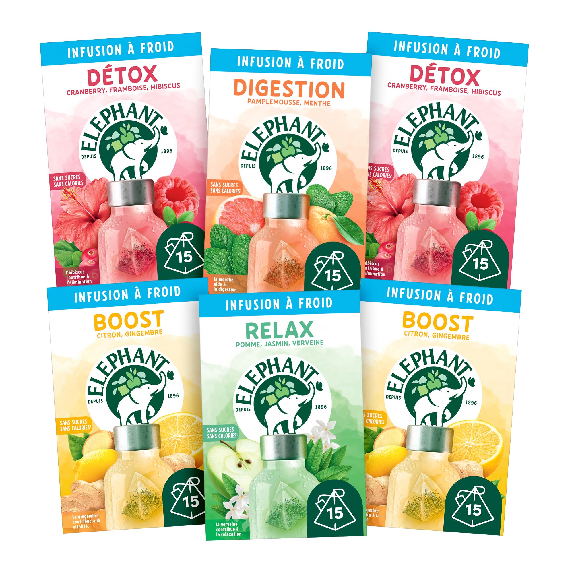 : Discover our Cold Brew Pack of 90 sachets (6 x 15) Detox: Give your water a touch of freshness with the Cranberry Raspberry Hibiscus Detox cold brew. Enjoy the perfect blend of cranberry's acidity, raspberry's fruity notes, and hibiscus's delicate floral scent. A refreshing moment of well-being awaits! Boost: Give your day a boost with the Lemon Ginger Boost cold brew. Discover the sparkling and spicy combination of lemon and ginger for a refreshing drink that naturally flavors your water. Awaken your vitality with every sip! Relax: Immerse yourself in serenity with the Relax cold brew. Savor the sweet notes of apple, combined with the delicate fragrance of jasmine and the lemony freshness of verbena. Enjoy a soothing and refreshing moment that invites you to stay zen! Digestion: Bring gentleness and comfort to Aid your digestion with Digestion Cold Brew. Savor the harmony between the fruity notes of apple, the floral scent of jasmine, and the lemony freshness of verbena. A delicious drink for a moment of natural well-being! By selecting Rainforest Alliance Certified herbs, Éléphant is committed to protecting the planet while contributing, every day, to a better world for people and nature. It's our way of infusing joy and good cheer. The secret to our infusions? 100 natural ingredients, just for you. Éléphant has meticulously selected the best plants to offer you its range of Cold Brews. Éléphant Cold Brew recipes are composed solely of plants, fruits, and natural flavorings. They are sugar-free, calorie-free, and caffeine-free. For a perfect tasting experience, steep the Pyramid infusion bag for 5 minutes in 500 ml of cold water, shake, and enjoy! The adventure Elephant began in 1896, and, as far as elephants can remember, that's quite an experience for a tea maker. Its greatest pleasure has always been to awaken our taste buds! With its deep connection to nature, Elephant selects the finest plants to create unique and delicious infusions, loved by all. And that's not all: in addition to its expertise, Elephant adds a touch of kindness, simplicity, a dash of humor, and a hint of originality. Join the tribe and discover the other gourmet recipes in our Cold Brew Infusions range! Ingredients: lemongrass, ginger (Zingiber officinale) 20 , natural flavoring, apple, natural flavoring, spearmint, white hibiscus, lemon peel 2 . P.when('A').execute(function(A) { A.on('a:expander:toggle_description:toggle:collapse', function(data) { window.scroll(0, data.expander. expander[0].offsetTop-100) }) }) Instructions: Add 1 tea bag to a glass of cold water, let it steep for 5-10 minutes, then remove the tea bag and enjoy. See moreRESPONSIBLE PACKAGING: Because we love our planet, we've said goodbye to plastic wrap. Our tea boxes are recyclable and made from cardboard sourced from sustainably managed forests. Our tea bags are plant-based. ? PREPARATION INSTRUCTIONS: For the perfect brew, steep the Pyramid tea bag for 5 minutes in 500 ml of cold water, stir, and enjoy! HEALTHY AND 100 NATURAL DRINKS: Elephant Cold Brew recipes are made with only natural plants, fruits, and flavorings. Sugar-free, calorie-free, and caffeine-free, you can enjoy them throughout the day, as much as you like. ? APPLE, JASMINE, AND VERBENA: EXPLODING FLAVORS: Awaken your water and your taste buds with this herbal tea combining the sweetness of apple, the delicate notes of jasmine, and verbena, known for its relaxing properties. A RELAXING COLD INFUSION: Refresh yourself with Elephant Relax Cold Infusion a delicious blend that will offer you a moment of calm throughout the day. Let the good vibes infuse!Description du produit "Découvrez notre Pack Infusions à Froid 90 sachets (6x15) Détox : Offrez à votre eau une touche de fraîcheur avec l'infusion à froid Détox Cranberry Framboise Hibiscus. Savourez l'alliance parfaite entre l'acidité de la cranberry, les notes fruitées de la framboise et la délicatesse florale de l'hibiscus. Un moment de bien-être rafraîchissant vous attend ! Boost : Donnez un coup de fouet à votre journée avec l'infusion à froid Boost Citron Gingembre. Découvrez le mariage pétillant et épicé du citron et du gingembre, pour une boisson fraîche qui parfume naturellement votre eau. Réveillez votre vitalité à chaque gorgée ! Relax : Plongez dans la sérénité avec l'infusion à froid Relax. Savourez les notes gourmandes de la pomme, alliées au délicat parfum du jasmin et à la fraîcheur citronnée de la verveine. Profitez d'un moment apaisant et rafraîchissant qui vous invite à rester zen ! Digestion : Apportez douceur et confort à votre digestion avec l'infusion à froid Digestion. Savourez l'harmonie entre les notes fruitées de la pomme, le parfum floral du jasmin et la fraîcheur citronnée de la verveine. Une boisson délicieuse pour un moment de bien-être naturel ! En sélectionnant des herbes certifiées Rainforest Alliance, Éléphant s'engage à protéger la planète tout en contribuant, chaque jour, à un monde meilleur pour l'humain et la nature. C'est notre manière d'infuser joie et bonne humeur. Le secret de nos infusions ? Des ingrédients 100 d'origine naturelle, rien que pour vous. Éléphant a minutieusement sélectionné les meilleures plantes pour vous offrir sa gamme d'Infusions à Froid. Les recettes Eléphant Infusion à froid sont uniquement composées de plantes, de fruits et d'arômes naturels. Elles sont sans sucres, sans calories et sans caféine Pour une dégustation parfaite, laissez infuser le sachet d'infusion Pyramid 5 minutes dans 500 ml d'eau froide, agitez et dégustez ! L'aventure Éléphant a commencé en 1896 et, de mémoire d'éléphant, c'est une sacrée expérience pour un créateur d'infusions. Depuis toujours, son plus grand plaisir est de réveiller nos papilles ! Fort de son écoute de la nature, Éléphant sélectionne les meilleures plantes pour créer des infusions uniques et délicieuses, adorées de tous. Et ce n'est pas t