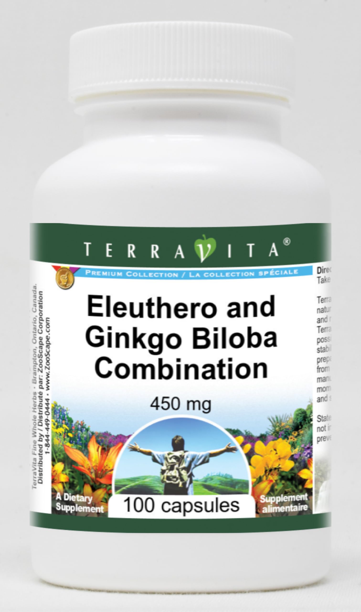 Eleuthero and Ginkgo Biloba Combination - 450 mg (100 capsules, ZIN: 516387) Packaged in the United States in a GMP certified facility (Good Manufacturing Practice). No fillers. Manufacturer: TerraVita Size: 100 capsules Easy-to-swallow Capsules in a sealed bottle. Ingredients: Gelatin, Water, Ginkgo Biloba Leaf - 225 mg, Eleuthero - 225