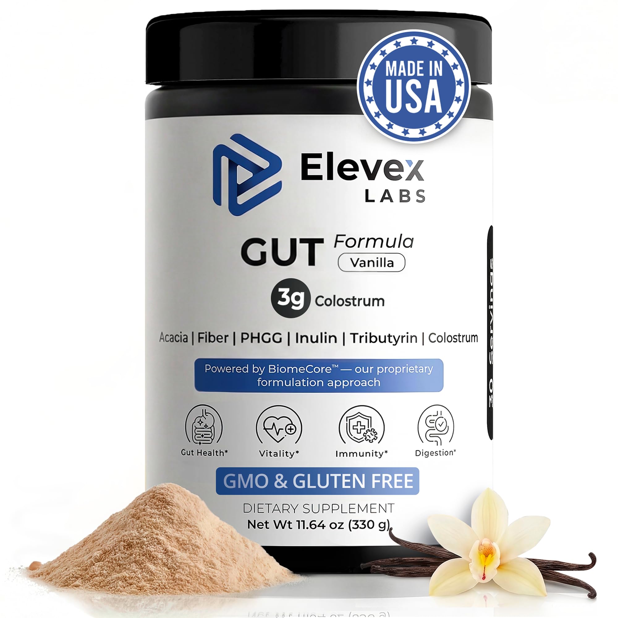 Elevex Gut Health Powder 3g Colostrum (30% IgG) + Tributyrin ( 60% Butyrate Purity) + PHGG Prebiotics Gut Lining, Gut Brain & Bloating Support BiomeCore 30 Servings (Vanilla)