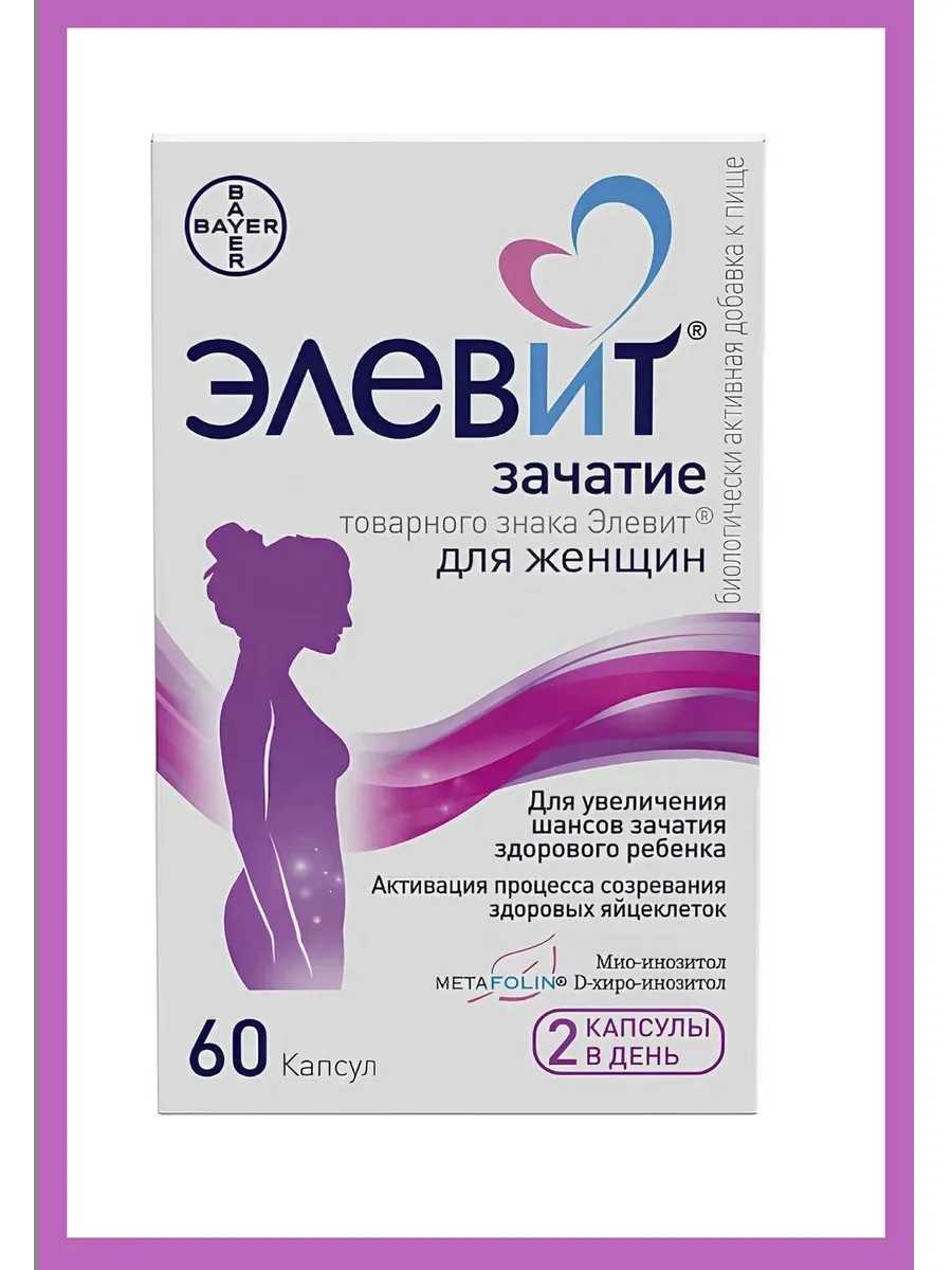 БАД Элевит Зачатие предназначен для увеличения шансов зачатия здорового ребенка. Активирует процесс созревания здоровых яйцеклеток. Женщинам, планирующим беременность и в период первого триместра беременности принимать по 2 капсулы 1 раз в день во время еды. Продолжительность приема - 1 месяц.