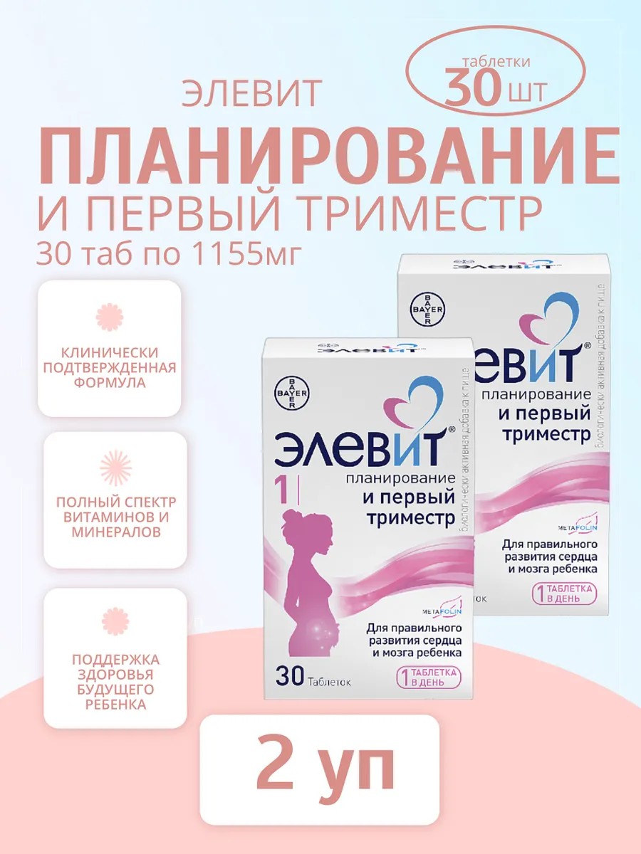 | Полное наименование товара | Элевит планирование и первый триместр 30 шт. таблетки массой 1155 мг |