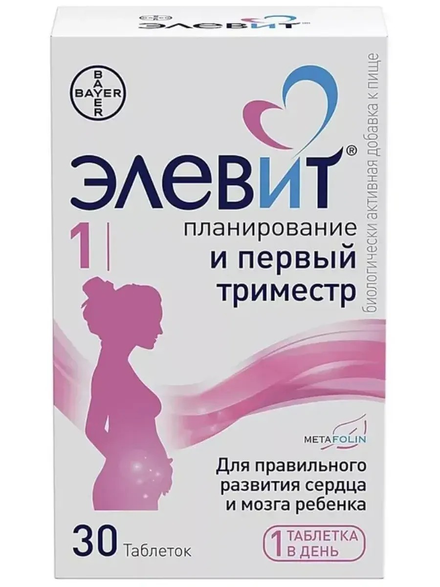 в качестве биологически активной добавки к пище для женщин, планирующих беременность и в период первого триместра беременности - дополнительного источника витаминов А, В1, В2, В5, В6, В12, С, D, Е; ниацина, фолиевой кислоты, биотина, железа, меди, йода, цинка, магния, марганца, селена; содержащей кальций. Элевит Планирование и первый триместр содержит специальную форму фолатов - Метафолин, а также 11 витаминов и 8 микроэлементов, включая йод и железо.Продукт содержит компоненты, полученные с использованием генно-модифицированных микроорганизмов (ГММ). Продукт очищен от ГММ. Продукт не содержит генно-модифицированных организмов.