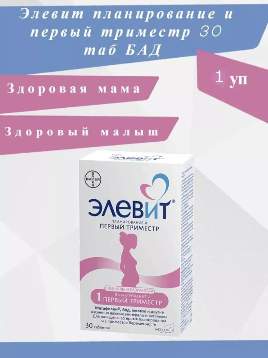 Витаминно-минеральный комплекс для беременных в 1 триместре и планирующих беременность. Фолаты рекомендованы для снижения риска дефектов нервной трубки плода и других пороков развития плода.Метафолин – форма фолатов, которая усваивается организмом лучше, чем фолиевая кислота.Йод необходим для нормального функционирования щитовидной железы, благотворно влияет на развитие мозга плода. Железо способствует поддержанию необходимого уровня гемоглобина, участвует в транспорте кислорода в организме, предупреждает развитие анемии в период беременности.Магний участвует в формировании мышечной и костной тканей, участвует в синтезе белка.Витамины группы В усиливают защитный эффект фолатов.Цинк способствует поддержанию репродуктивной функции женщин, играет роль в процессе правильного формирования тканей, необходим для синтеза ДНК.ПоказанияВыбираете, какие витамины лучше пить при беременности?Элевит Планирование и первый триместр – уникальный мультивитаминный комплекс, который способствует правильному формированию эмбриона в первом триместре беременности.Первый триместр беременности:формирование эмбриона начинается с момента оплодотворения яйцеклетки и продолжается в течении первого триместра беременности. Это важнейший период беременности, когда закладывается фундамент для роста и развития организма будущего малыша.Чтобы ребенок родился здоровым, важно обеспечить поступление всех необходимых элементов с первых дней беременности.brПротивопоказанияИндивидуальная непереносимость компонентов.Не превышать рекомендуемую суточную дозу.Перед применением рекомендуется проконсультироваться с врачом.Способ применения и дозыЖенщинам планирующим беременность и в период первого триместра беременности по 1 таблетке в день во время еды.Условия храненияВ оригинальной упаковке в недоступном для детей месте при температуре не выше 25 °С.