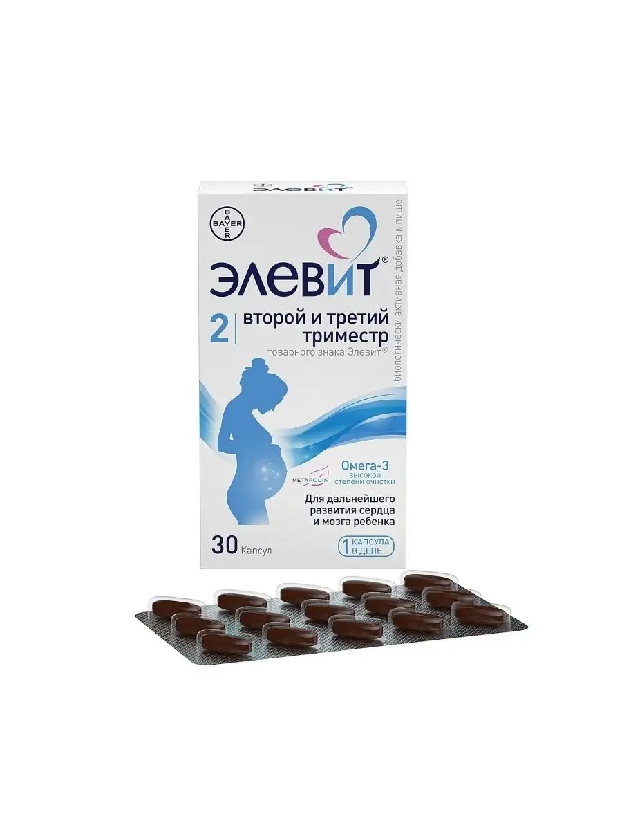Элевит 2 Второй и Третий Триместр - это второй продукт в линейке Элевит. Рекомендован со 2-го триместра беременности и до рождения ребенка. Содержит 12 витаминов и 6 микроэлементов, а также омега-3 высокой степени очистки в 1 капсуле. Способствует дальнейшему развитию сердца и мозга ребенка. Продукт содержит комбинацию фолатов: фолиевую кислоту (200 мгк) и Метафолин (225 мгк). Эффективность фолиевой кислоты в поддержке правильного формирования ребенка во время беременности хорошо изучена. Метафолин является современной формулой фолиевой кислоты, которая не требует дополнительной активации ферментами. Данная комбинация обеспечивает поддержку правильного формирования сердца и мозга ребенка. Женщинам, планирущим беременность, и в период первого триместра беременности принимать по 1 таблетке в день во время еды.