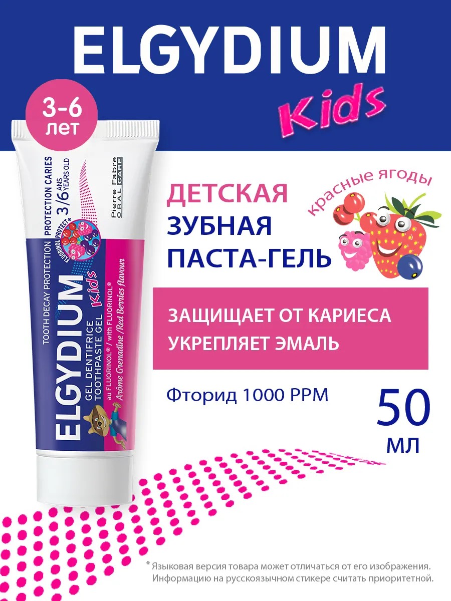 | Полное наименование товара | ORAL CARE ELGYDIUM Детская зубная паста-гель от кариеса со вкусом красных ягод 3-6 лет, 50 мл |