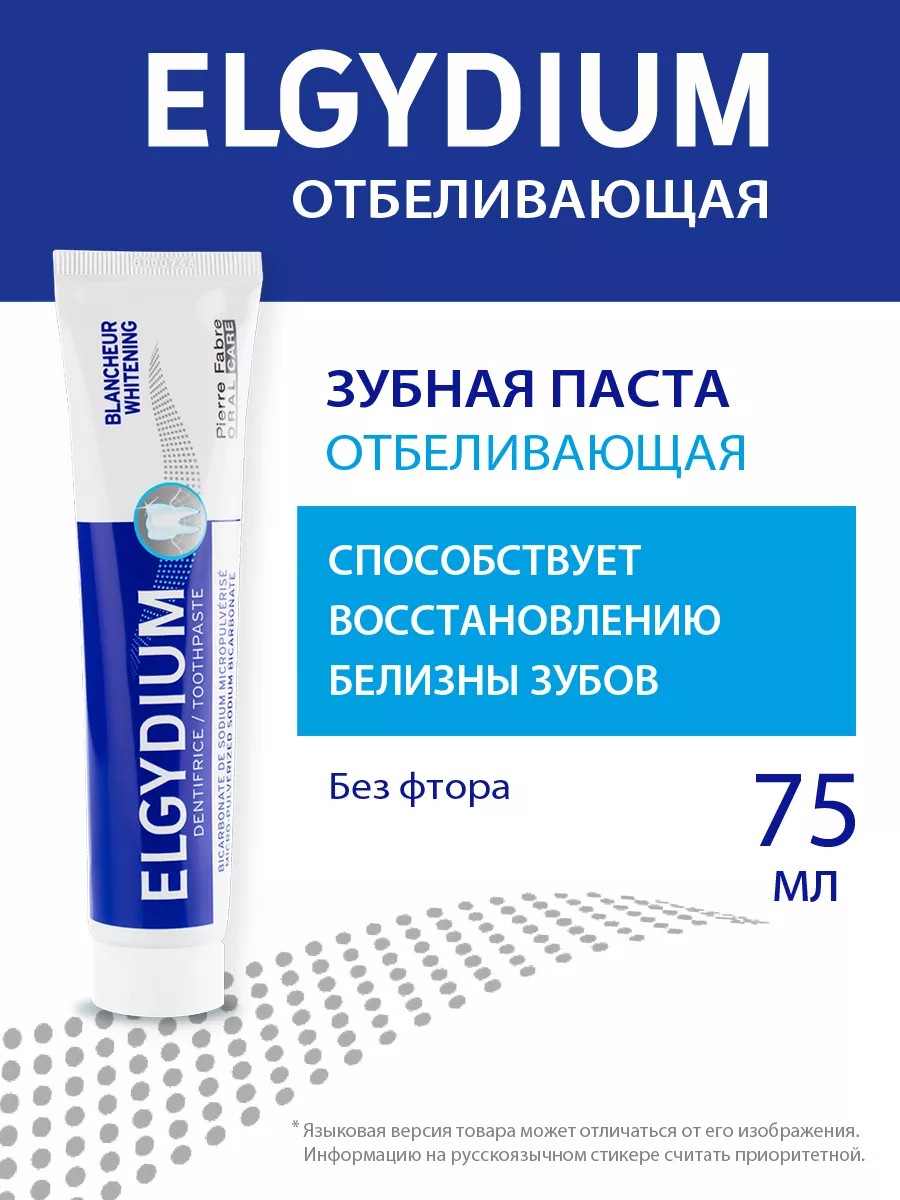 Отбеливающая зубная паста для ежедневного гигиенического ухода ELGYDIUM Toothpaste whitening / blancheur,75, мл. Способствует восстановлению натурального блеска и белизны зубов, сохраняя эмаль. Способствует удалению пятен с поверхности зубной эмали, появление которых связано в основном с приемом пищи и курением. Благодаря пасте Эльгидиум зубы дольше сохраняют белизну после профессионального удаления зубного камня или отбеливания. Использовать для чистки зубов 2 – 3 раза в день после каждого приема пищи. Возможно легкое раздражение десен, связанное с эффективностью продукта. В этом случае необходимо увеличить интервалы между использованием зубной пасты и чередовать ее с зубной пастой для чувствительных десен. Содержание хлоргексидина биглюконата: 0,004%. Не содержит фтор.