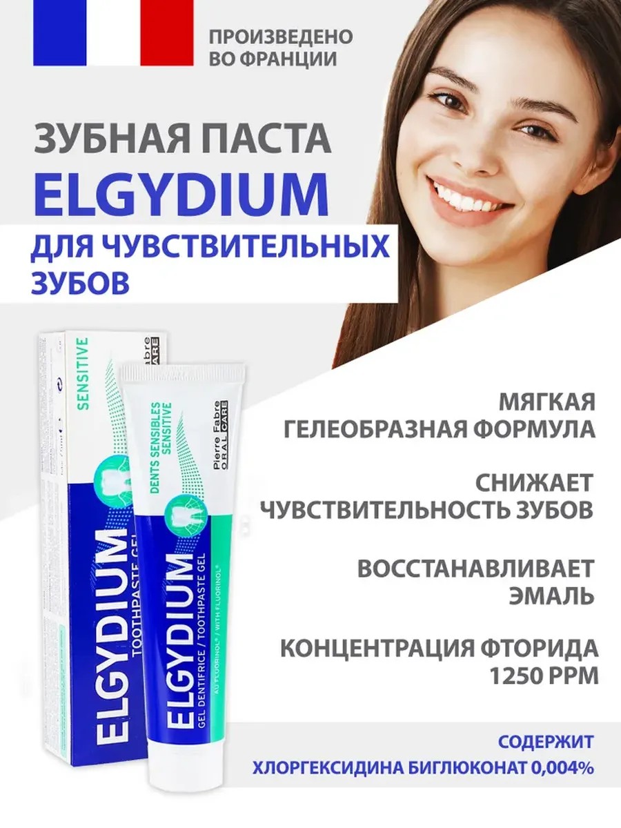 Зубная паста Эльгидиум Elgydium Sensitive для чувствительных зубов 75 мл - лечебно-профилактическая зубная паста-гель с низким абразивным действием, рекомендуемая для регулярной чистки и обеспечивающая эффективную защиту чувствительным зубам, благодаря содержанию высокой дозы фторида (1250 ppm ионов фторида)