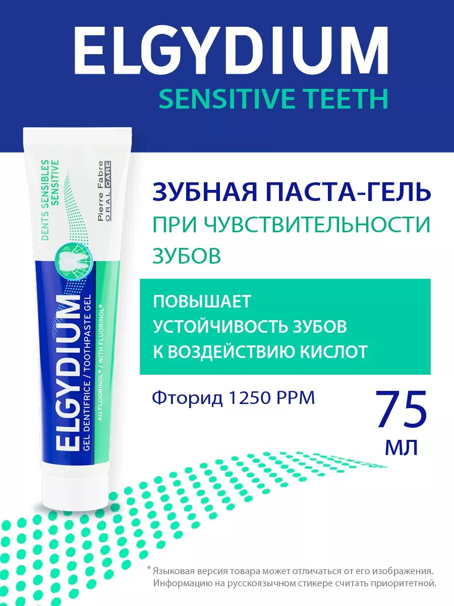 Elgydium SENSITIVE Toothpaste-Gel with Fluorinol for Sensitive Teeth, 75 ml. This soft, low-abrasive gel-paste helps reduce tooth sensitivity and effectively protect teeth from external factors (e.g., hot, cold, etc.). Elgydium Sensitive contains Fluorinol (Nicomethanol Hydrofluoride), a second-generation aminofluoride that promotes remineralization, reduces sensitivity, strengthens and protects tooth enamel, and increases its resistance to acids. The mint flavor is fresh and pleasant. Contains fluoride: 1250 ppm F- fluoride mass fraction. Contains chlorhexidine bigluconate (0.004%). Directions for use: For daily oral hygiene. Brush your teeth 2-3 times a day, after each meal. It is advisable to use a toothbrush with soft bristles. Store at a temperature not exceeding 25C.