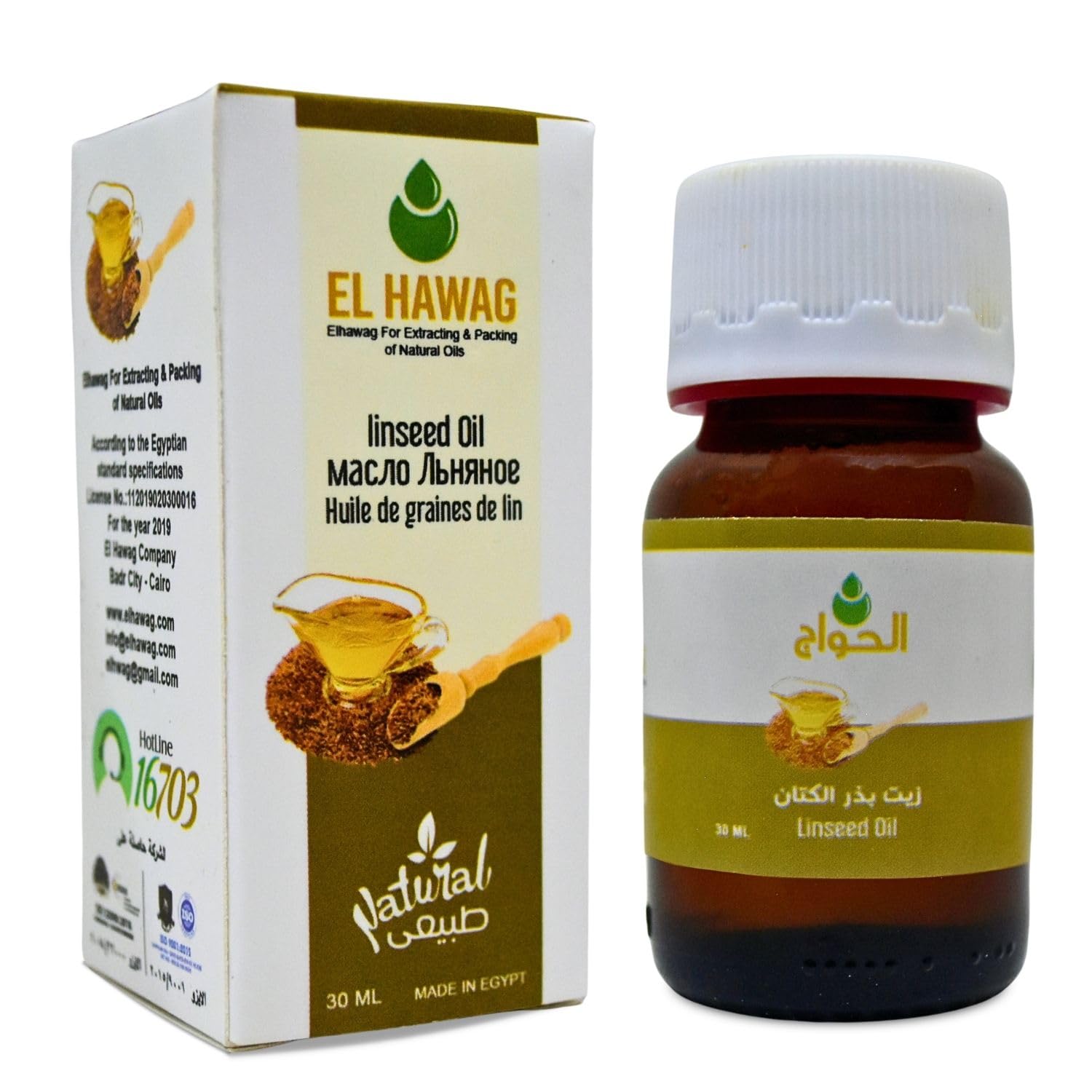 - Item Description : Elhawag Linseed Oil Cold Pressed Premium Natural Pure Undiluted Hawag Fresh Original Al Hawaj Concentrated Crude Perfect Fresh It Has Many Uses Body Useful For Cooking Hair Skin Care Non Gmo Kosher Halal ( 1 Pack 1 oz 30 ml ) ? ? - Flaxseed Oil Cold Pressed : An Excellent Choice For Creating Most Any Dish , Whether You Are Cooking For Your Family Or Restaurant And Oil Versatile . , It Is Used In Cooking And Is Widely Used As Oil Rich , Add Versatility In Your Kitchen With This Light Tasting Oil , Great For Cooking . - Linseed Oil Or (Hot Oil As It Is Known) Is An Oil That Is Used In Food And Is Extracted From The Flax Plant , For Used In Hair , Oil Is The Best Alternative To Fish Oil For Vegetarians . - 100 Pure Elhawag Linseed Oil Provides You With The Best Of Natural Great Ingredients And Linseed Oil Is Naturally Extracted From The Finest Linseed And Oil Extraction : Steam Distillation . - For The Skin : Cold Pressed Or Carrier Oils Can Be Applied Directly To Skin . Use It Alone Or With Other Oils To Nourish Your Skin . - Weight (Approx.) : 1 Pack 1.01 oz 30 ml - Manufacture Expiration Dates Indicated On The Main Package Are In European Format Which Is DD MM YY .