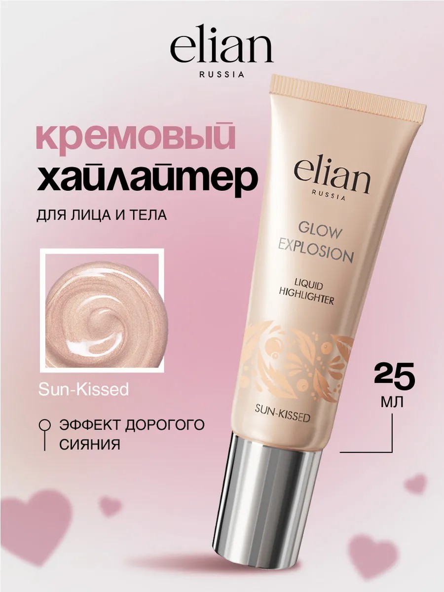 Elian Russia Glow Explosion Creamy Highlighter for Face and Body, Sun-Kissed / Tanned / Beige. Volume: 25 ml. Elian Russia presents the radiant GLOW EXPLOSION highlighter – a delicate creamy texture with millions of pearlescent particles for a natural glow. This liquid highlighter is an excellent solution for contouring and creating a natural makeup look. Thanks to its ultra-fine particles, it imparts a soft-focus radiance to the skin without emphasizing texture or flaking. This liquid highlighter will help highlight specific areas of the face, creating more sculpted features. The product's base is extremely long-lasting: 30 seconds after application, it sets completely and stays luminous until you remove your makeup. This creamy highlighter is suitable for all skin types and offers a wide range of shades – from fair to golden. It also perfectly conceals redness and shine, while maintaining a natural look and nourishing your skin to keep it soft and hydrated. HOW TO USE: Apply to the high points of your cheekbones, bridge of your nose, the curve of your upper lip, and the inner corners of your eyes. It spreads easily and evenly over your skin, imparting a soft, subtle hue. Add a drop of GLOW EXPLOSION highlighter to your matte foundation or primer to create a trendy, natural satin or radiant finish. A subtle lifting effect can be achieved by applying the product to the most prominent areas of your skin. Russian decorative cosmetics by Elian are made with love for girls from all over the world. It makes a great gift for Women's Day or a birthday for a girlfriend, mother, friend, teenager, sister, woman, or colleague. Elian Russia highlighter will bring you joy in the process of creating your face makeup; be sure to add it to your makeup bag!