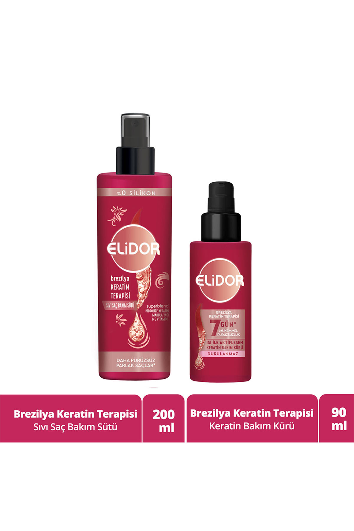 Elidor Heat-Activated Keratin Care Cure Brazilian Keratin Therapy Hydrolyzed Keratin Marula Oil Vitamin E 90 ml Elidor Brazilian Keratin Therapy Care Cure has been prepared for you with a special formula that deeply nourishes your hair. The Hydrolyzed Keratin, Vitamin E and Marula Oil in it perfectly nourish your hair and help you achieve smooth hair. Thanks to this rich formula, every strand of your hair gains a healthy and beautiful appearance that reflects you. For best results, start by washing your hair with Brazilian Keratin Therapy Shampoo and Serum Care Conditioner. Divide your damp, towel-dried hair into equal parts. Apply 2-3 pumps of product, avoiding the roots of your hair. Divide your hair into equal parts and pass a straightener over each strand of hair 3-5 times at 180 degrees. Comb your hair and dry thoroughly. Enjoy your perfectly straight and smooth hair that looks shiny and silky soft for 7 days. Do you know how you can achieve perfectly straight hair in 4 steps with the new Elidor Brazilian Keratin Therapy Series? Start by washing your hair with Elidor Brazilian Keratin Therapy Shampoo, and after rinsing, massage in Serum Care Cream to revitalize it. After showering, nourish and moisturize your hair with Keratin Care Milk, and have instantly softer and shinier hair. Finally, after applying the Keratin Care Cure, pass each strand of hair with a straightener 3-5 times at 180 degrees. Enjoy your perfectly straight and smooth hair for 7 days . compared to untreated hair Up to 4 washes Ingredients: Aqua, Cyclopentasiloxane, Amodimethicone, Stearamidopropyl Dimethylamine, Cetyl Alcohol, Caprylic Capric Triglyceride, Polyquaternium-28, Cyclohexasiloxane, Phenoxyethanol, Polyquaternium Crosspolymer-3, Dimethicone, Glycerin, Paraffinum Liquidum, Parfum, Aspartic acid, Distearoylethyl Dimonium Chloride, Cetearyl Alcohol, Acrylamidopropyltrimonium Chloride Acrylamide Copolymer, PVM MA Copolymer, Sorbitan Oleate, PPG-1 Trideceth-6, Disodium EDTA, C11-13 Isoparaffin, Sodium Hydroxide, Caprylyl Glycol, PEG-4 Laurate, PEG-4 Dilaurate, PEG-15 Hydroxystearate, PEG-4, Iodopropynyl Butylcarbamate, Lecithin, Citric Acid, Sclerocarya Birrea Seed Oil, Hydrolyzed Keratin, Tocopheryl Acetate, Alpha-Isomethyl Ionone, Benzyl Alcohol, Benzyl Benzoate, Benzyl Salicylate, Citronellol, Geraniol, Hexyl Cinnamal, Hydroxycitronellal, Limonene, Linalool. Elidor Liquid Hair Care Milk Brazilian Keratin Therapy Hydrolyzed Keratin Marula Oil Vitamin E 200 ml Are you ready for hair therapy with Elidor? Here is the new Elidor Brazilian Keratin Therapy Liquid Hair Care Milk! When your hair is damaged by external factors, it loses the nutrients and strengthening elements it needs. No need to worry anymore! New Elidor Brazilian Keratin Therapy Shampoo has a special formula enriched with Hydrolyzed Keratin, Vitamin E and Marula Oil. This formula nourishes and strengthens the keratin layer of the hair and also helps prevent frizz. The new Elidor Brazilian Keratin Therapy Liquid Hair Care Milk gives your hair a silky soft touch. It deeply nourishes the hair strands and provides a smooth appearance. Your hair gets stronger, healthier and shinier day by day. Elidor Brazilian Keratin Therapy Liquid Hair Care Milk pampers your hair with a fragrant and soft milk consistency that you will feel while washing your hair. It makes you feel relaxed and refreshed while cleansing your hair. The new Elidor Brazilian Keratin Therapy Liquid Hair Care Milk is designed to make you feel special every day with your renewed and vibrant hair. Perfectly smooth hair in 4 steps with the new Elidor Brazilian Keratin Therapy! Usage: Shake the bottle well before use. Apply to damp or dry hair without touching the roots. Easily comb and style. Use regularly as part of your daily hair care routine. Product Content: Aqua, Glycerin, Cetearyl Alcohol, Cocos Nucifera (Coconut) Oil, Sodium Benzoate, Behentrimonium Chloride, Parfum, Dipropylene Glycol, Lactic Acid, Disodium EDTA, Sclerocarya Birrea Seed Oil, Hydrolyzed Keratin, Tocopheryl Acetate, Alpha-Isomethyl Ionone, Benzyl Alcohol, Benzyl Benzoate, Benzyl Salicylate, Citronellol, Geraniol, Hexyl Cinnamal, Hydroxycitronellal, Limonene, Linalool.