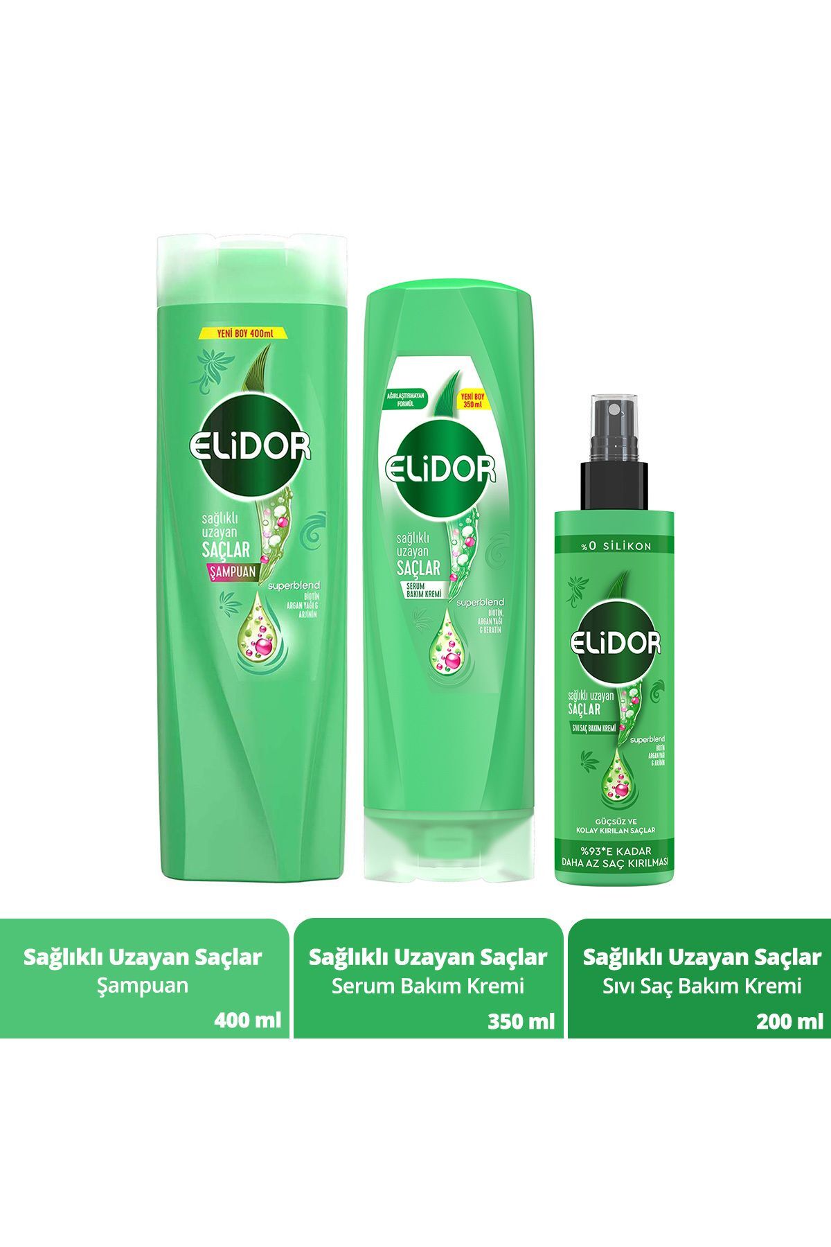 Elidor Superblend Hair Care Shampoo Healthy Growing Hair Biotin Argan Oil Arginine 400 ml It is everyone's dream for the hair to maintain its health, shine and vitality while growing. Elidor Superblend Healthy Growing Hair Hair Care Shampoo, which you can use for long hair care, provides the hair strands with the energy they need while growing, with its special formula. By using the special Superblend blended shampoo, you can achieve the long and natural-looking hair you dream of. Elidor Superblend Instant Growth Hair Care Shampoo, one of the shampoos developed for healthy growing hair, nourishes the hair from root to tip with its biotin-containing formula, making it more resistant to breakage. Elidor Healthy Growing Hair Hair Care Shampoo's formula containing Argan Oil, known for its softening of the hair, and Arginine, known for its nourishing properties, cares for all hair strands from root to tip, supporting healthy hair growth. The special formula of the shampoo ensures that the hair is much stronger than before against damaging effects. Elidor Healthy Growing Hair Hair Care Shampoo provides the hair with the vitamins, proteins and oils it needs with its Superblend mixture and supports healthy hair growth with its biotin formula. Add Elidor Healthy Growing Hair Shampoo to your hair care routine and see the difference. Usage: So how to use this shampoo? Apply a sufficient amount of product to your wet hair. Massage the hair into a lather and then rinse thoroughly. If the product comes into contact with your eyes, rinse your eyes with plenty of water. To achieve better results, you can use the product together with products in the Elidor Healthy Growing Hair series. Ingredients: Aqua, Sodium Laureth Sulfate, Sodium Chloride, Cocamidopropyl Betaine, Dimethiconol, Parfum, Sodium Benzoate, Citric Acid, Carbomer, TEA-Dodecylbenzenesulfonate, Guar Hydroxypropyltrimonium Chloride, TEA-Sulfate, Hydroxypropyl Methylcellulose, Mica, Disodium EDTA, PEG-45M, Phenoxyethanol, PPG-9, Lysine HCl, Sodium Hydroxide, Arginine, Silica, Argania Spinosa Kernel Oil, Panthenol, Niacinamide, Ascorbic Acid, Tocopheryl Acetate, Biotin, Benzyl Alcohol, Benzyl Salicylate, Citronellol, Hexyl Cinnamal, Limonene, Linalool, CI 77891. Elidor Superblend Serum Hair Care Cream Healthy Growing Hair Biotin Argan Oil Keratin 350 ml It is everyone's dream for hair to maintain its health, shine and vitality while growing. Elidor Superblend Healthy Growing Hair Serum Care Cream, which you can use for long hair care, provides the hair strands with the energy they need while growing, with its special formula. By using the special Superblend blended serum care cream, you can achieve the long and natural-looking hair you dream of. Elidor Superblend Instant Growth Hair Serum Care Cream, one of the care creams developed for healthy growing hair, also nourishes the hair from root to tip, making it more resistant to wear. Thanks to the argan oil and biotin formula of Elidor Healthy Growing Hair Serum Care Cream, you can feel the softening in your hair from the first application. The special formula of the hair care cream ensures that the hair becomes softer and easier to shape, and is much stronger against damaging effects than before. Elidor Healthy Growing Hair Serum Care Cream, with its Superblend mixture, provides the hair with the vitamins, proteins and oils it needs, and with its biotin formula, it supports healthy hair growth and does not weigh the hair down. Add Elidor Healthy Growing Hair Serum Care Cream to your hair care routine and see the difference. Usage: So how to use this conditioner? After washing with shampoo, gently apply Elidor Superblend Healthy Growing Hair Serum Care Cream from the middle of the hair strands to the ends. After waiting 30 seconds, rinse your hair with water. To achieve better results, you can use the product together with products in the Elidor Healthy Growing Hair series. Product Content: Aqua, Cetearyl Alcohol, Stearamidopropyl Dimethylamine, Parfum, Dimethicone, Lactic Acid, Sodium Chloride, Disodium EDTA, Amodimethicone, Lysine HCl, PEG-7 Propylheptyl Ether, Cetrimonium Chloride, Phenoxyethanol, Magnesium Nitrate, Methylchloroisothiazolinone, Magnesium Chloride, Argania Spinosa Kernel Oil, Methylisothiazolinone, Hydrolyzed Keratin, Panthenol, Niacinamide, Ascorbic Acid, Tocopheryl Acetate, Biotin, Benzyl Salicylate, Citronellol, Hexyl Cinnamal, Limonene, Linalool. Elidor Superblend Liquid Hair Care Cream Healthy Growing Hair Biotin Argan Oil Arginine 200 ml Are you ready to meet Elidor's best blend ever? Introducing Elidor Healthy Growing Hair Liquid Hair Care Cream with its renewed Superblend formula! Well-groomed hair is with you with Elidor Healthy Growing Hair Liquid Hair Care Cream, which supports the healthy growth of your hair. Elidor Healthy Growing Hair Liquid Hair Care Cream It nourishes your hair with its Superblend formula containing Biotin, Argan Oil and Arginine. This magnificent formula of Elidor Healthy Growing Hair Liquid Hair Care Cream helps your hair grow with nourishment and without breakage. Elidor Healthy Growing Hair Liquid Hair Care Cream, which supports healthy hair growth with its nutritional content, is also a liquid hair care cream that allows your hair to be easily combed. It cares for your hair with the active level of coconut oil it contains. Moreover, it repairs your hair against damage caused by the negative effects of UV rays . The powerful formula of the liquid hair care cream does not contain silicone. Add Elidor Healthy Growing Hair Liquid Hair Care Cream to your hair care routine and see the difference. Repair on the hair surface against UV damage. Usage: So how to use this conditioner? Shake the bottle well before using the liquid conditioner. Then apply the product to damp or dry hair without touching the roots. Comb your hair easily and style it as you wish. Product Content: Aqua, Glycerin, Cetearyl Alcohol, Cocos Nucifera (Coconut) Oil, Sodium Benz
