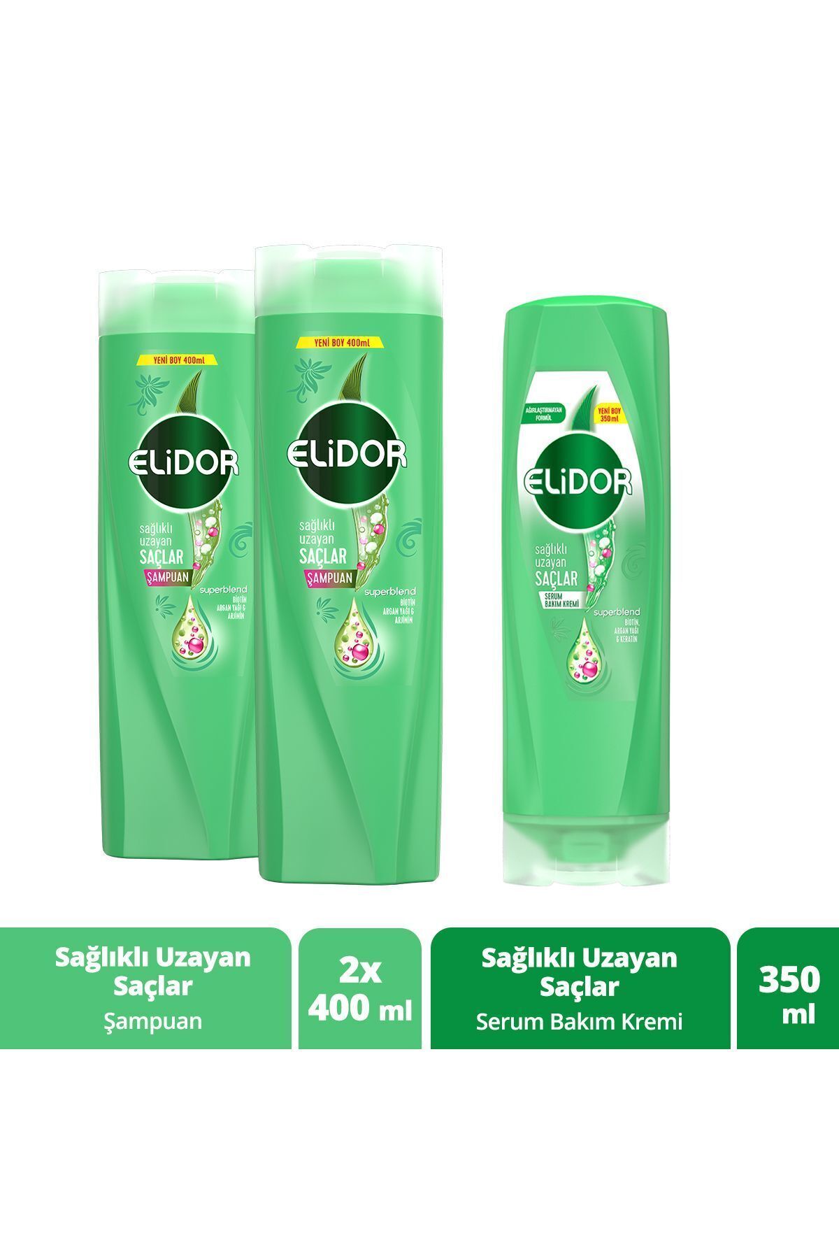 Elidor Superblend Hair Care Shampoo Healthy Growing Hair Biotin Argan Oil Arginine 400 mlEveryone's dream is for hair to maintain its health, shine and vitality as it grows. Elidor Superblend Healthy Growing Hair Hair Care Shampoo, which you can use for long hair care, provides the hair strands with the energy they need while growing, with its special formula. By using the special Superblend blended shampoo, you can achieve the long and natural-looking hair you dream of.Elidor Superblend Instant Growth Hair Care Shampoo, one of the shampoos developed for healthy growing hair, nourishes the hair from root to tip with its biotin-containing formula, making it more resistant to breakage. Elidor Healthy Growing Hair Hair Care Shampoo's formula containing Argan Oil, known for its softening of the hair, and Arginine, known for its nourishing properties, cares for all hair strands from root to tip, supporting healthy hair growth. The special formula of the shampoo ensures that the hair is much stronger than before against damaging effects.Elidor Healthy Growing Hair Hair Care Shampoo provides the hair with the vitamins, proteins and oils it needs with its Superblend mixture and supports healthy hair growth with its biotin formula.Add Elidor Healthy Growing Hair Shampoo to your hair care routine and see the difference.Usage: So how to use this shampoo? Apply a sufficient amount of product to your wet hair. Massage the hair into a lather and then rinse thoroughly. If the product comes into contact with your eyes, rinse your eyes with plenty of water. To achieve better results, you can use the product together with products in the Elidor Healthy Growing Hair series.Ingredients: Aqua, Sodium Laureth Sulfate, Sodium Chloride, Cocamidopropyl Betaine, Dimethiconol, Parfum, Sodium Benzoate, Citric Acid, Carbomer, TEA-Dodecylbenzenesulfonate, Guar Hydroxypropyltrimonium Chloride, TEA-Sulfate, Hydroxypropyl Methylcellulose, Mica, Disodium EDTA, PEG-45M, Phenoxyethanol, PPG-9, Lysine HCl, Sodium Hydroxide, Arginine, Silica, Argania Spinosa Kernel Oil, Panthenol, Niacinamide, Ascorbic Acid, Tocopheryl Acetate, Biotin, Benzyl Alcohol, Benzyl Salicylate, Citronellol, Hexyl Cinnamal, Limonene, Linalool, CI 77891.Elidor Superblend Serum Hair Care Cream Healthy Growing Hair Biotin Argan Oil Keratin 350mlEveryone's dream is for hair to maintain its health, shine and vitality as it grows. Elidor Superblend Healthy Growing Hair Serum Care Cream, which you can use for long hair care, provides the hair strands with the energy they need while growing, with its special formula. By using the special Superblend blended serum care cream, you can achieve the long and natural-looking hair you dream of.Elidor Superblend Instant Growth Hair Serum Care Cream, one of the care creams developed for healthy growing hair, also nourishes the hair from root to tip, making it more resistant to wear. Thanks to the argan oil and biotin formula of Elidor Healthy Growing Hair Serum Care Cream, you can feel the softening in your hair from the first application. The special formula of the hair care cream ensures that the hair becomes softer and easier to shape, and is much stronger against damaging effects than before.Elidor Healthy Growing Hair Serum Care Cream, with its Superblend mixture, provides the hair with the vitamins, proteins and oils it needs, and with its biotin formula, it supports healthy hair growth and does not weigh the hair down.Add Elidor Healthy Growing Hair Serum Care Cream to your hair care routine and see the difference.Usage: So how to use this conditioner? After washing with shampoo, gently apply Elidor Superblend Healthy Growing Hair Serum Care Cream from the middle of the hair strands to the ends. After waiting 30 seconds, rinse your hair with water. To achieve better results, you can use the product together with products in the Elidor Healthy Growing Hair series.Product Content: Aqua, Cetearyl Alcohol, Stearamidopropyl Dimethylamine, Parfum, Dimethicone, Lactic Acid, Sodium Chloride, Disodium EDTA, Amodimethicone, Lysine HCl, PEG-7 Propylheptyl Ether, Cetrimonium Chloride, Phenoxyethanol, Magnesium Nitrate, Methylchloroisothiazolinone, Magnesium Chloride, Argania Spinosa Kernel Oil, Methylisothiazolinone, Hydrolyzed Keratin, Panthenol, Niacinamide, Ascorbic Acid, Tocopheryl Acetate, Biotin, Benzyl Salicylate, Citronellol, Hexyl Cinnamal, Limonene, Linalool.