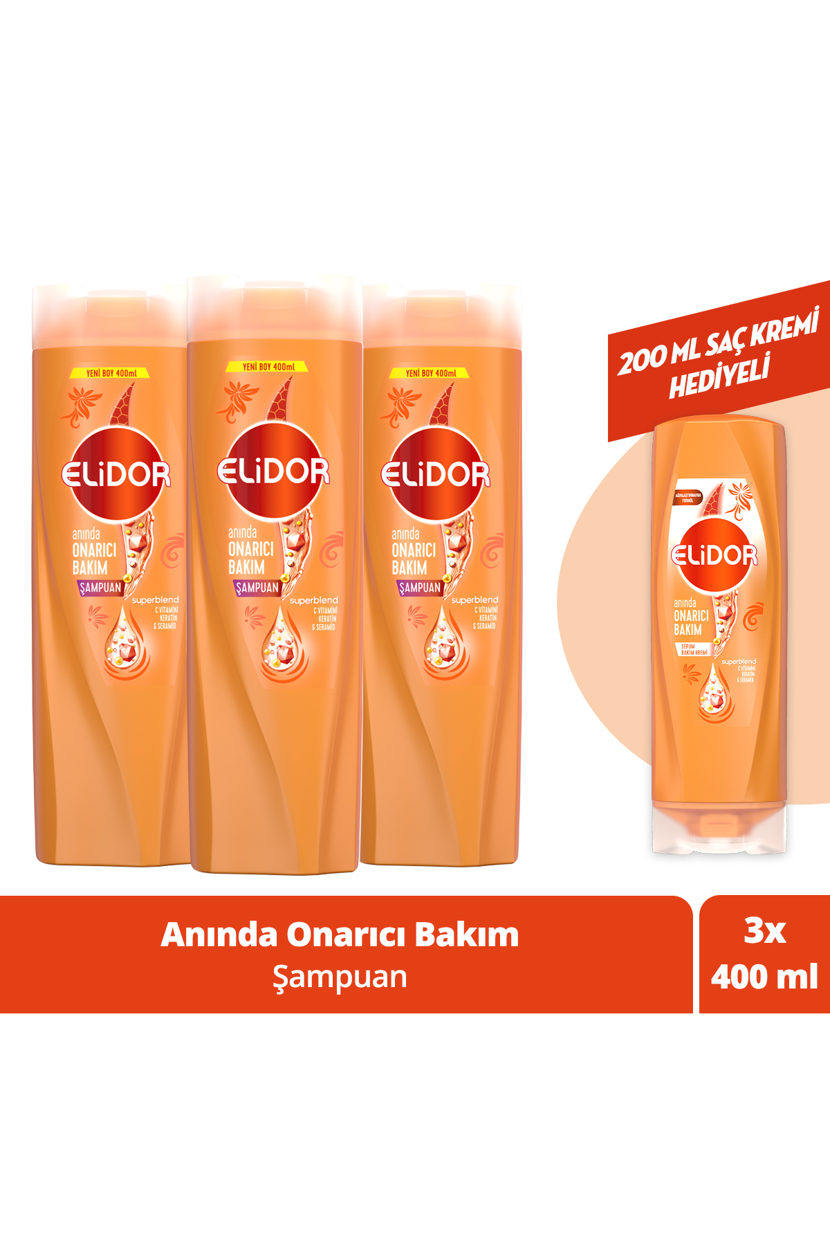 Elidor Superblend Hair Care Shampoo Instant Repair Care Vitamin C Keratin Ceramide 400 mlStrong and shiny hair is everyone's dream. Elidor Superblend Instant Repair Care Shampoo, which is especially effective on hair strands that are worn out and lose their strength for various reasons, penetrates deeply into your hair with its special formula, restructures the damaged bonds, strengthens your hair up to 5 times and provides protection against possible damage in the future. By using the special Superblend blended shampoo, you can achieve the strong and healthy hair you dream of.Elidor Superblend Instant Repair Care Shampoo, one of the best Elidor shampoos developed specifically for damaged hair, penetrates deeply into your hair with its formula containing Keratin and Ceramide, known to strengthen hair, restructures damaged bonds and strengthens your hair up to 5 times . The special Superblend formula, which also contains Vitamin C, penetrates into each broken and damaged hair strand and not only repairs your hair, but also protects against future damage.Elidor Instant Repair Care Shampoo, with its Superblend mixture, provides the hair with the vitamins, proteins and oils it needs, strengthens the hair from root to tip, and restructures damaged bonds.Add Elidor Instant Repair Care Shampoo to your hair care routine and see the difference.compared to non-conditioning shampooUsage: So how to use this shampoo? Apply a sufficient amount of product to your wet hair. Massage the hair into a lather and then rinse thoroughly. If the product comes into contact with your eyes, rinse your eyes with plenty of water.Ingredients: Aqua, Sodium Laureth Sulfate, Sodium Chloride, Cocamidopropyl Betaine, Dimethiconol, Parfum, Sodium Benzoate, Gluconolactone, Citric Acid, Carbomer, TEA-Dodecylbenzenesulfonate, Guar Hydroxypropyltrimonium Chloride, TEA-Sulfate, Sodium Sulfate, Hydroxypropyl Methylcellulose, Trehalose, Mica, Sodium Hydroxide, Disodium EDTA, PEG-45M, Phenoxyethanol, Lysine HCl, PPG-9, Hydrolyzed Keratin, Silica, Ceramide NG, Panthenol, Niacinamide, Ascorbic Acid, Tocopheryl Acetate, Biotin, Benzyl Salicylate, Citronellol, Geraniol, Hexyl Cinnamal, Limonene, Linalool, CI 77891.Elidor Superblend Hair Care Shampoo Instant Repair Care Vitamin C Ceramides Keratin 200 MLAre you ready to meet the new Elidor, which instantly repairs with its Superblend formula?Benefiting from the power of nature in hair care, Elidor shampoos and conditioners continue to add strength and energy to your hair with their special formulas containing protein and vitamins and carefully selected plant extracts.Elidor's best blend to date, Superblend, consists of a unique blend containing the vitamins, proteins and oils your hair needs. It is now much easier to achieve healthy-looking, strong and vibrant hair with the new Elidor Superblend Instant Repair Shampoo.We know that it is not easy to deal with damaged hair. Now, think of a shampoo that repairs and renews your hair from the first wash. Damaged hair is no longer your destiny with the new Elidor Superblend Instant Repair shampoo. Elidor repair shampoo nourishes, moisturizes and instantly revitalizes your hair. Elidor Superblend Instant Repair Shampoo helps to instantly give your hair a healthy, silky appearance with the oils containing powerful vitamins in its formula. With its formula containing ceramides and Vitamin C, it prevents frizz and restores the strength of the hair, and thanks to keratin, it renews, strengthens and helps repair the hair from the first wash.If you want your hair to be as strong as you as you take strong steps forward in life, be sure to try the new Superblend Instant Repair Shampoo containing ceramides, Vitamin C and keratin. If you want to have stronger hair, use it with Elidor Instant Repair Serum Care Cream!